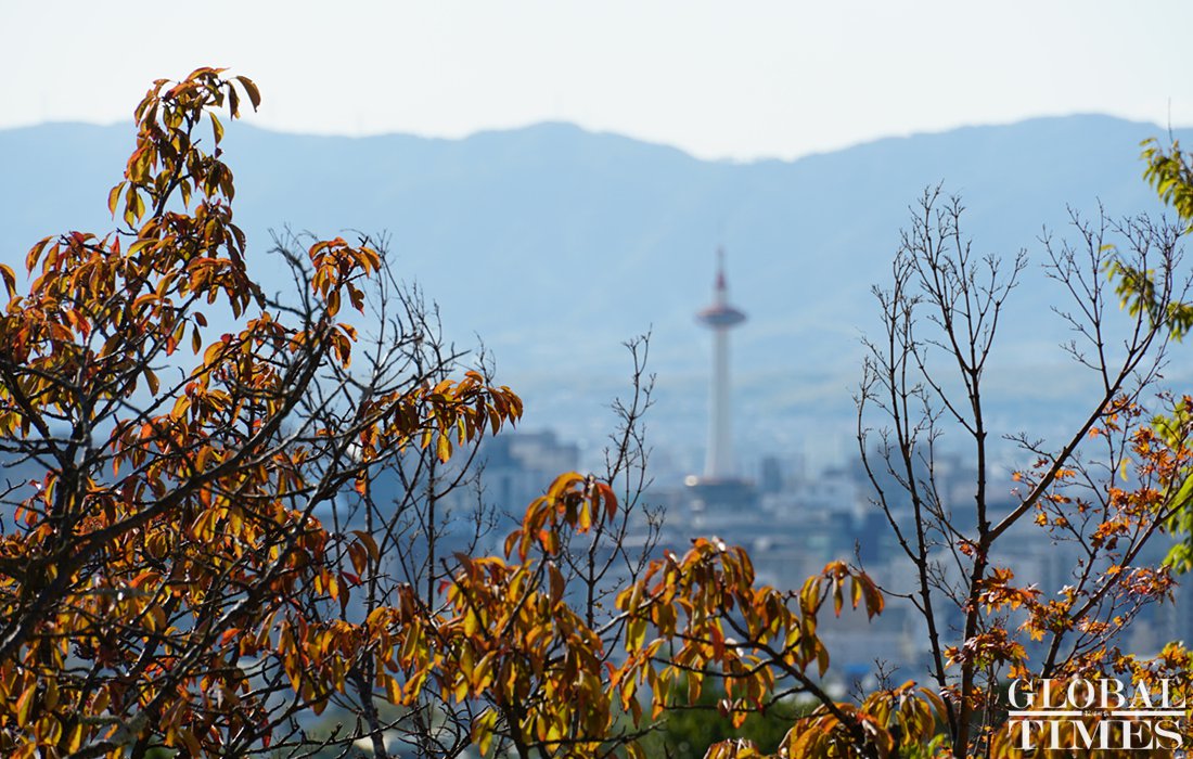 From an overlook in Sannenzaka Ninenzaka, the modern 133-meter tall Kyoto Tower can be seen through the yellowing leaves. Photo: Deng Zijun/GT figcaption >