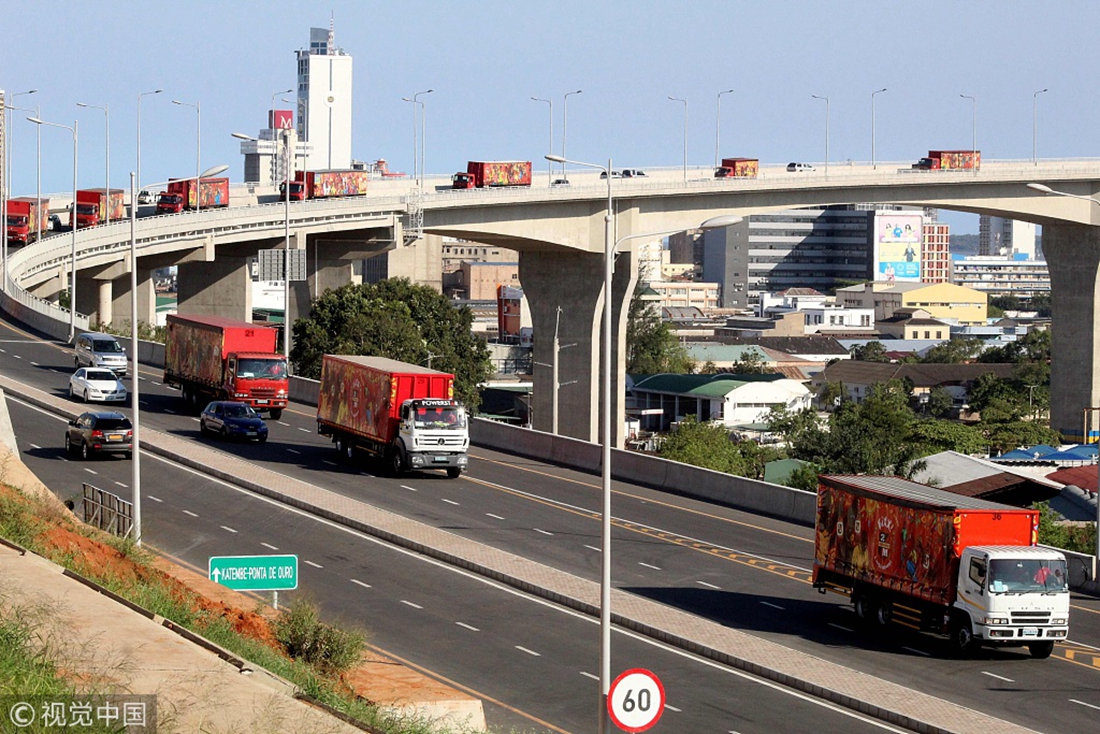 Cars drive under one of the towers supporting the newly inaugurated Maputo-Katembe Bridge in Maputo, Mozambique. Photo: Roberto Matchissa/VCG figcaption >