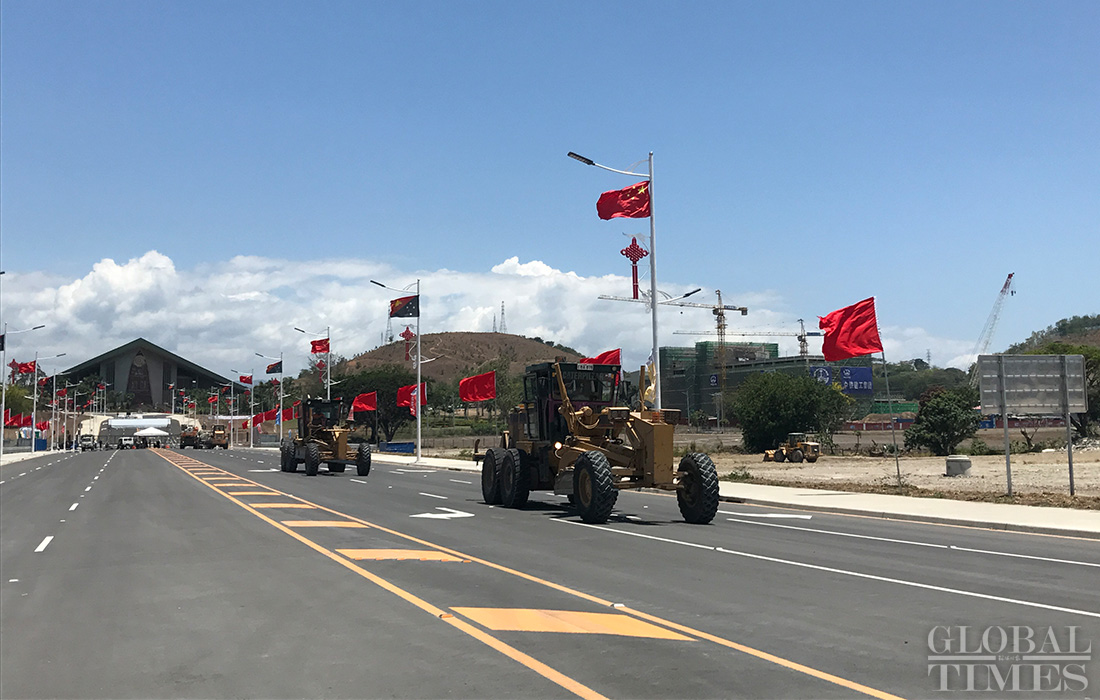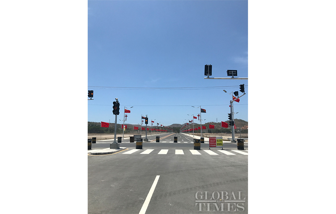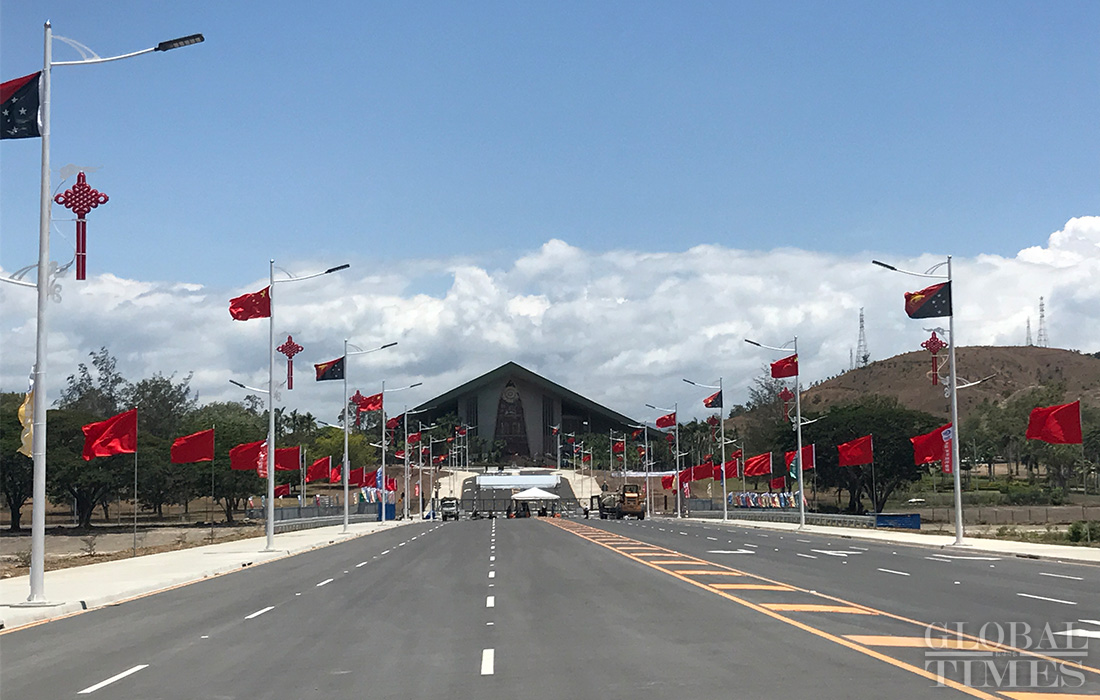 The Chinese and Papua New Guinean flags were raised along Port Moresby's Independence Boulevard, constructed by China Harbour Engineer Company, to welcome visiting Chinese President Xi Jinping.