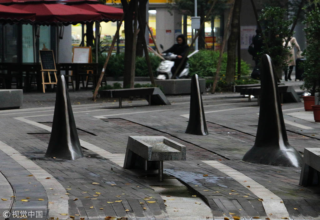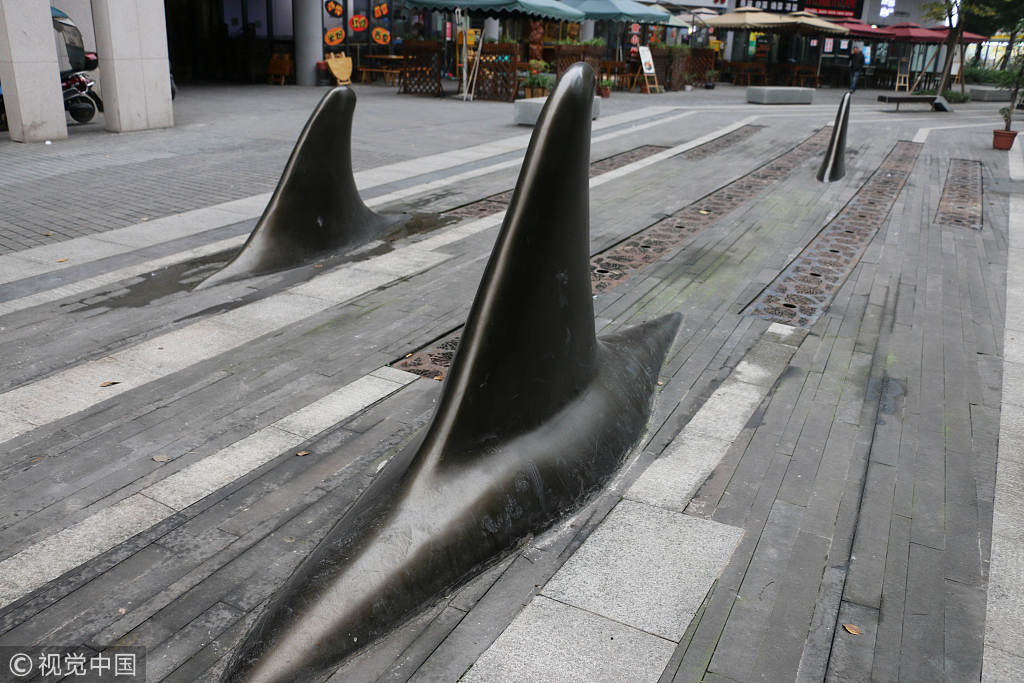 A row of shark-fin-shaped bollards appeared outside of a park in Chongqing, Southwest China, on November 20, 2018. According to reports, to ensure vehicles travel into and out of the park in an orderly fashion and passersby cross the street safely, the peculiar bollards were installed. (Photos: VCG)