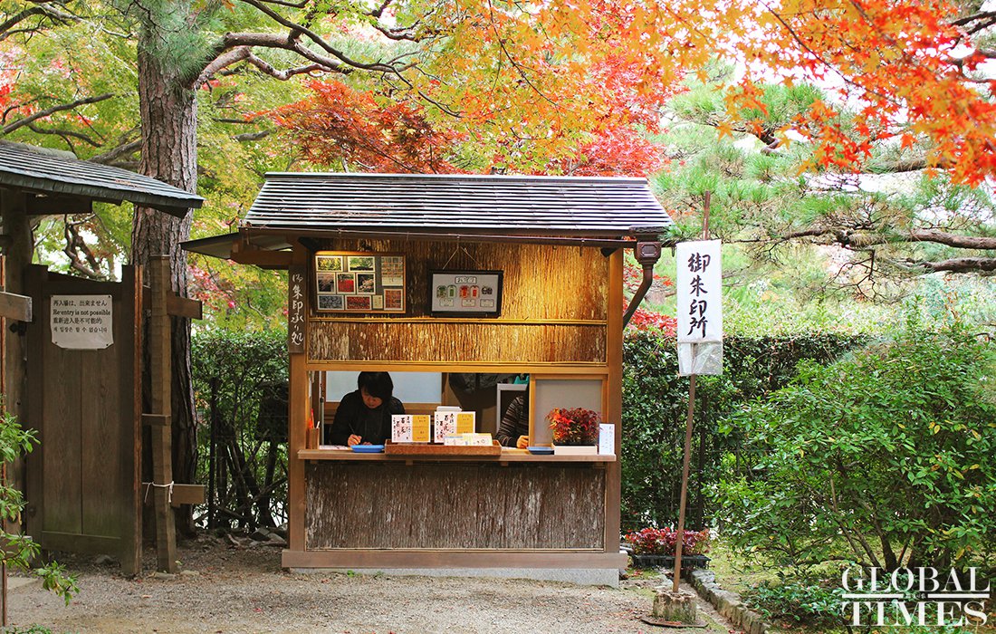 A woman works at a kiosk in a temple that is surrounded by red leaves in Arashiyama, Kyoto, Japan, on November 22. The fall foliage season is at its peak here. Photo: Courtesy of Zhang Yue figcaption >