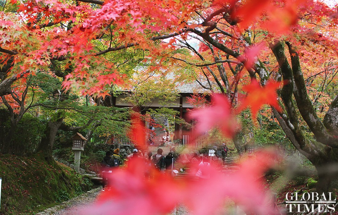 Tourists take photos of the red leaves in Arashiyama, Kyoto, Japan, on November 22. Photo: Courtesy of Zhang Yue figcaption >