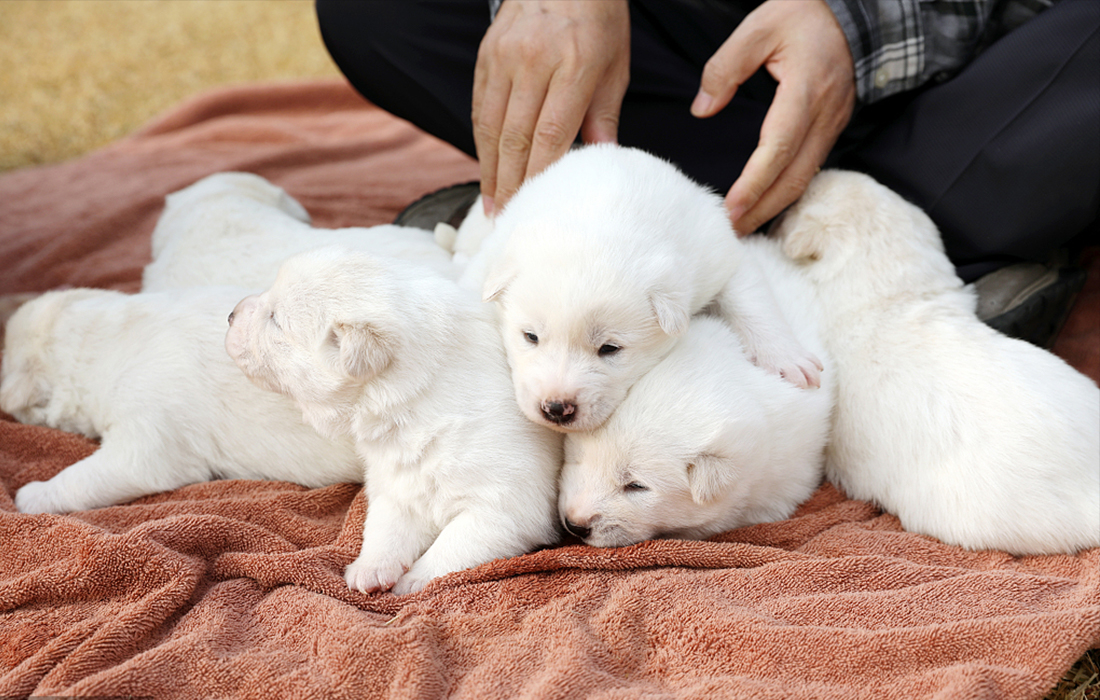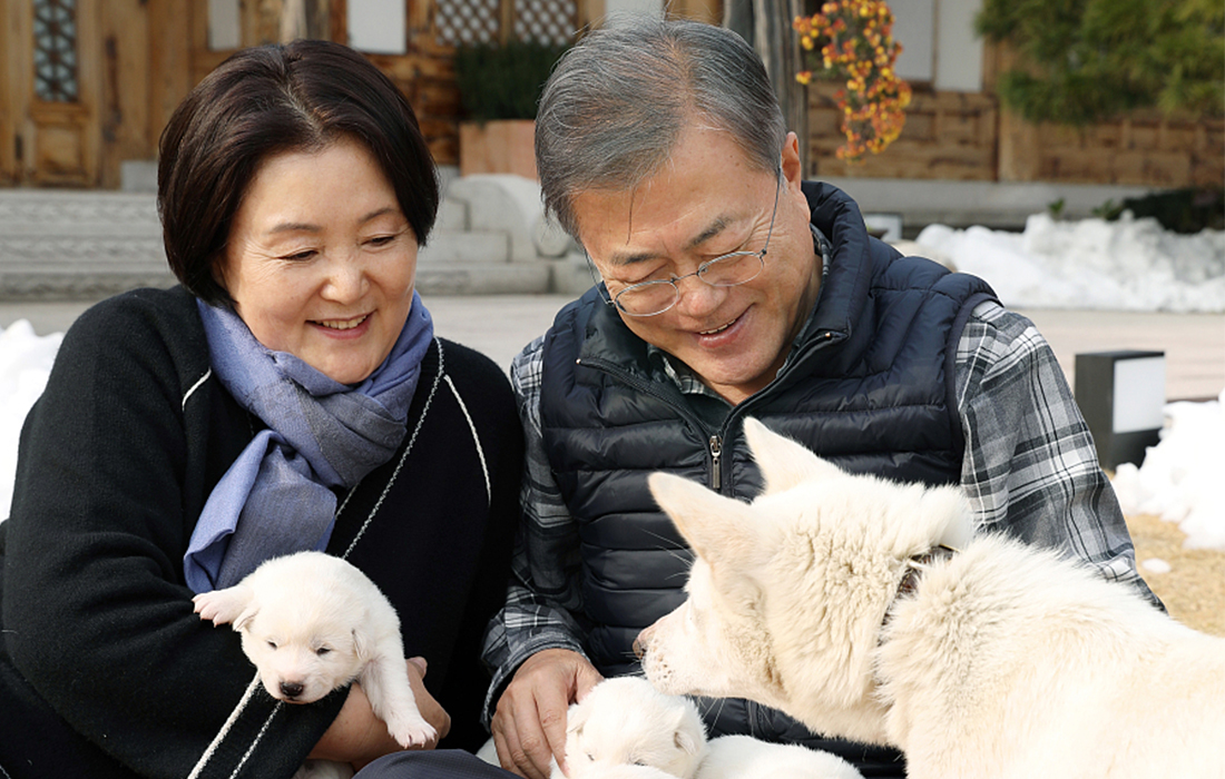 South Korean President Moon Jae-in and his wife Kim Jung-sook cuddle the puppies mothered by the North’s "peace gift" dog at the Blue House on November 25. The Pungsan hunting dogs are sent by the North Korean leader Kim Jong-un in September as “peace gift”.