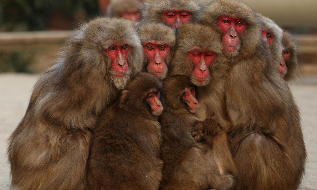 Several Japanese macaque monkeys cuddle together to protect themselves against the cold weather in Hyogo Prefecture of Japan’s Sumoto on January 18, 2014. figcaption >