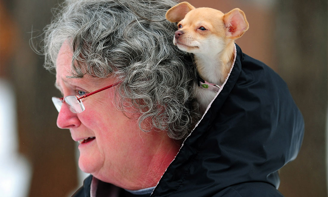 A 10-week-old Chihuahua puppy keeps warm in its owner’s hood in Indian Trail, North California on January 11, 2011. figcaption >