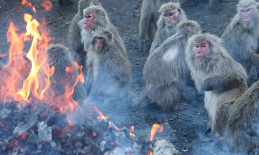 A group of Yakushima macaques warm themselves by a fire, which has become an annual event since 1959, at the Japan Monkey center in Inuyama, Aichi Prefecture of Japan on December 20, 2015. figcaption >