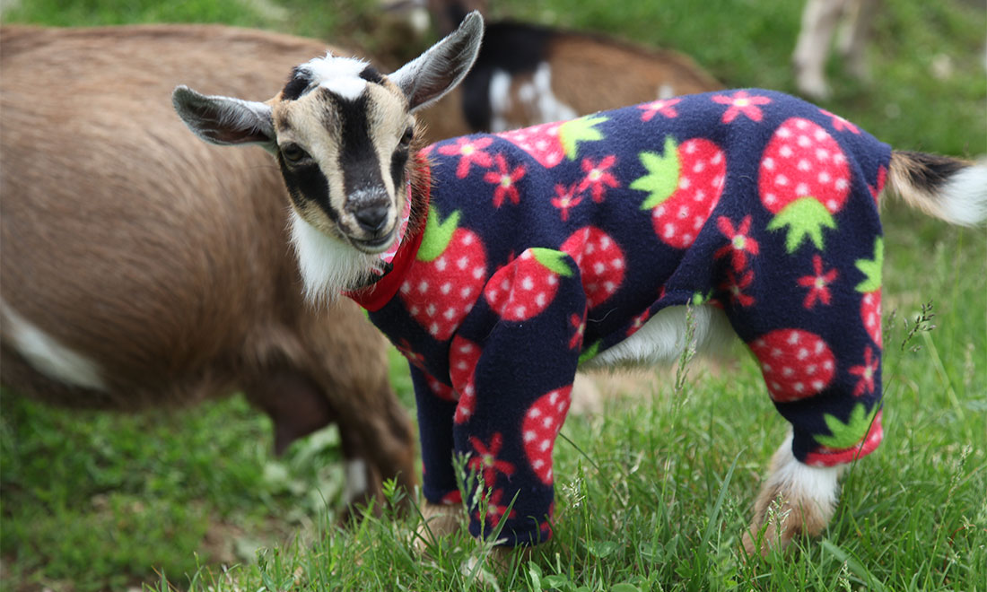 Hope Hall sports its baby goat pyjamas to warm up on the Sunflower Farm Creamery in Maine of US. figcaption >