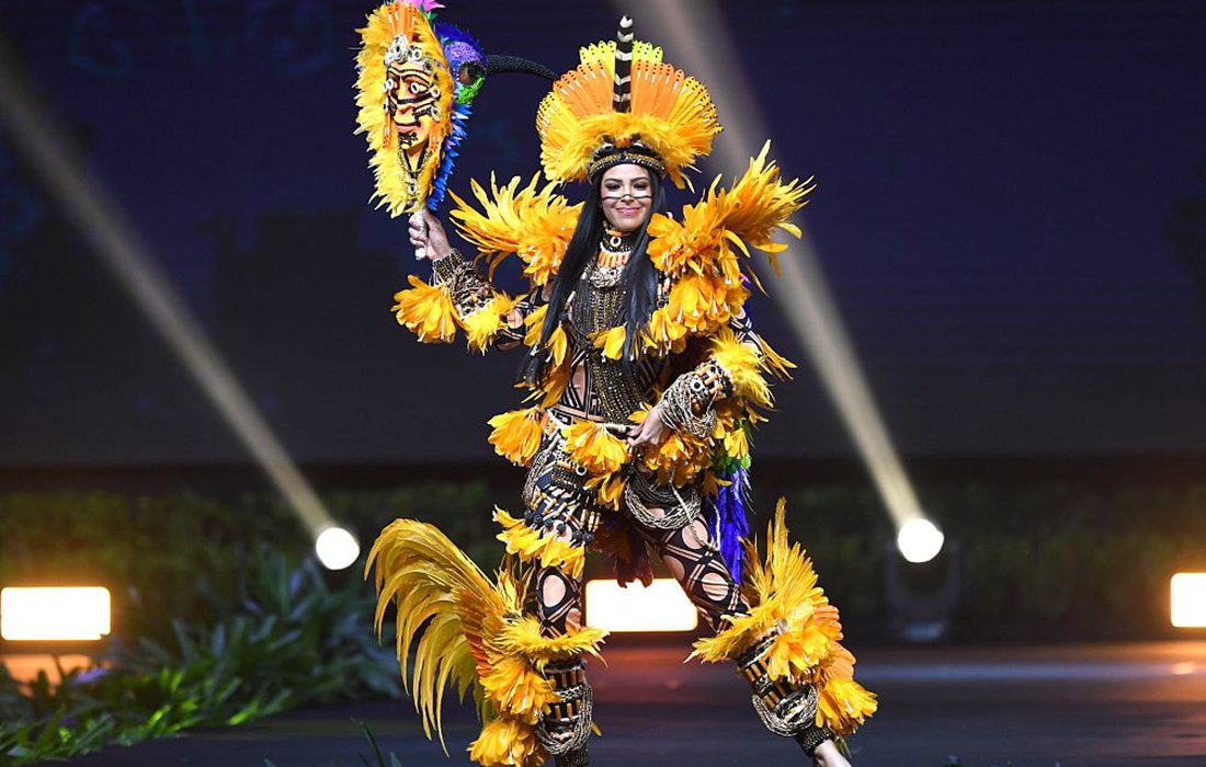 Mayra Dias is Miss Brazil 2018, and her costume is inspired by the Amazonian goddess that turns into a bird. Photo: VCG figcaption >