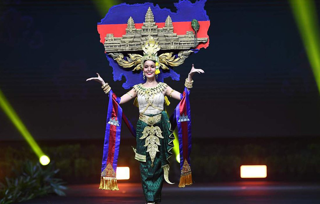 Nat Rern is Miss Cambodia 2018, and her costume is inspired by the Kingdom of Wonder, with a backdrop country map showing the famous landmark Angkor Wat. Photo: VCG figcaption >
