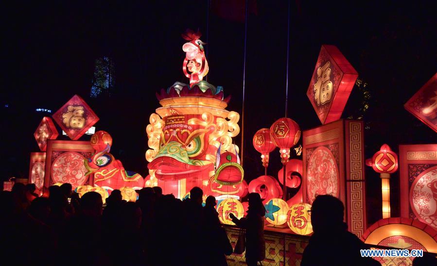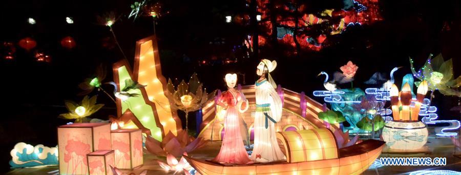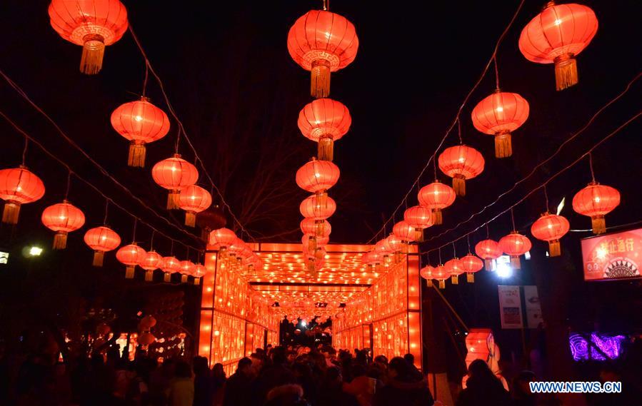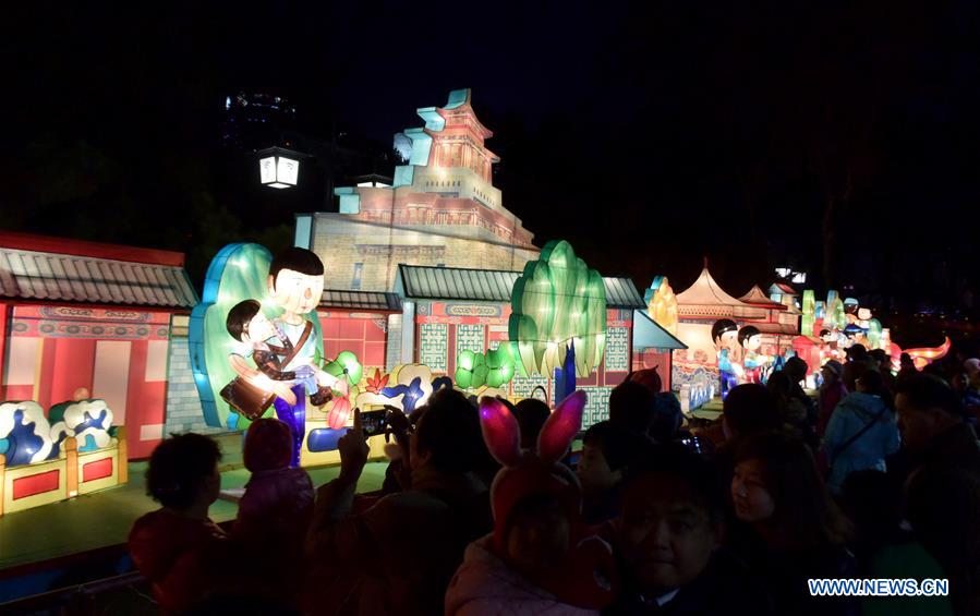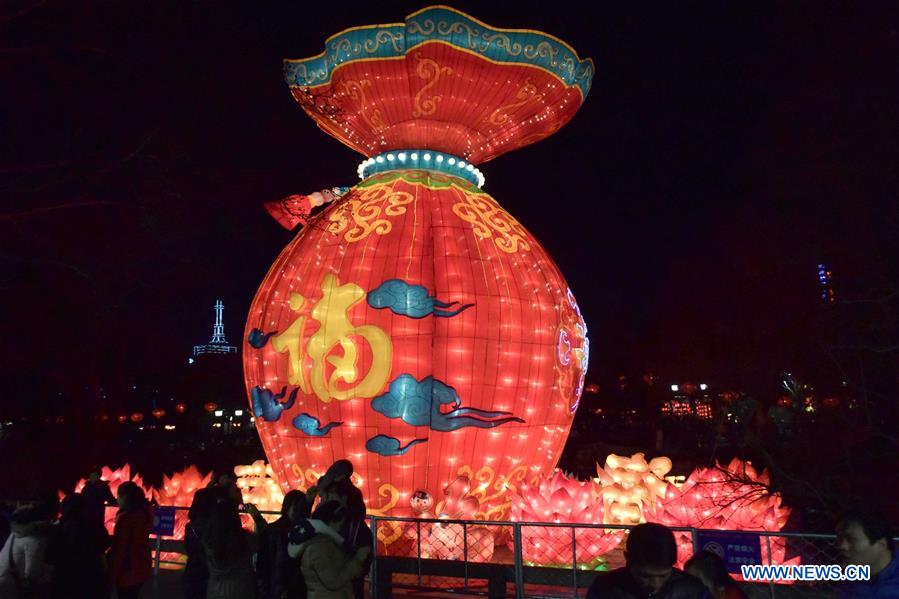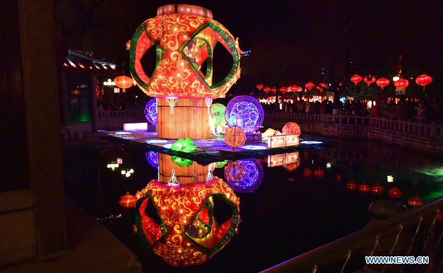 Tourists view colored lanterns at Baotu Spring Park in Jinan, capital of east China's Shandong Province, Feb 16, 2016. A lantern festival was held at the park to greet the Spring Festival and Lantern Festival this month.