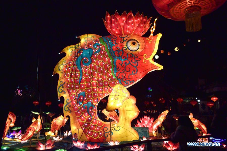 A fish-shaped colored lantern is lighted at Baotu Spring Park in Jinan, capital of east China's Shandong Province, Feb 16, 2016. A lantern festival was held at the park to greet the Spring Festival and Lantern Festival this month. Photo: Xinhua figcaption >