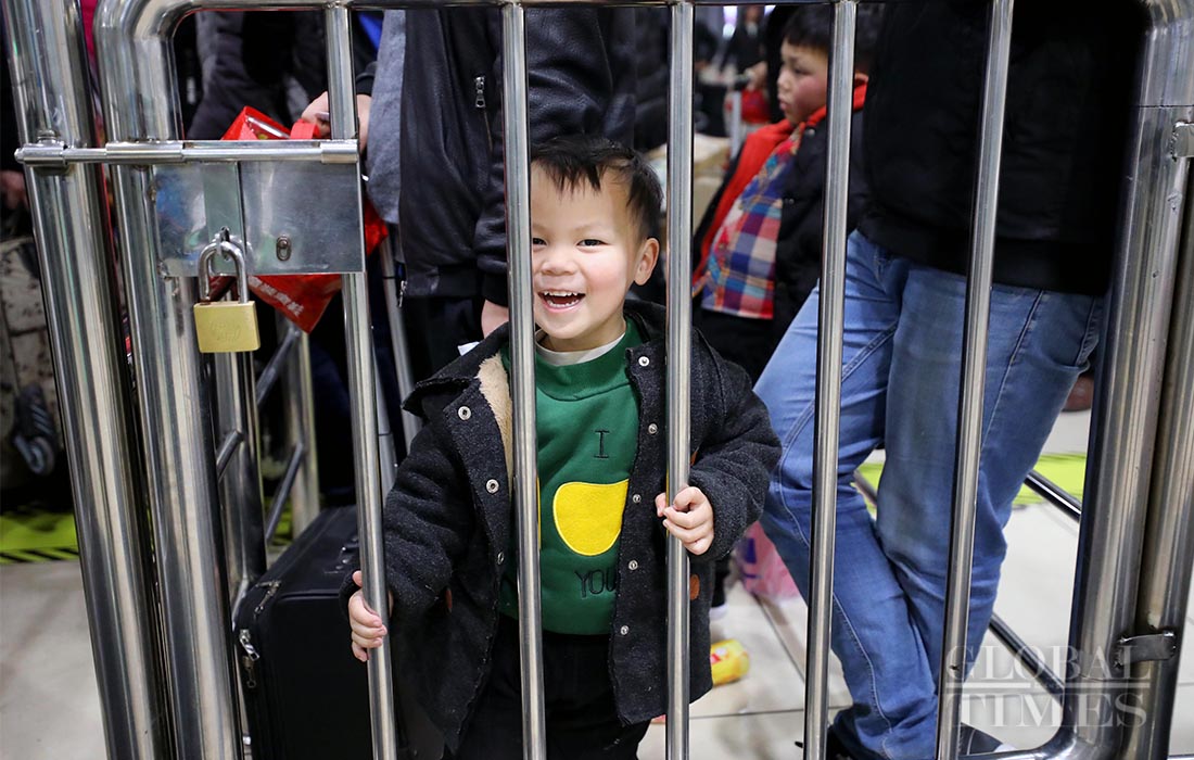 A boy smiles at the camera as he waits to board the train with his families at Shanghai railway station Jan 17, 2019. Photo: Yang Hui/GT figcaption >
