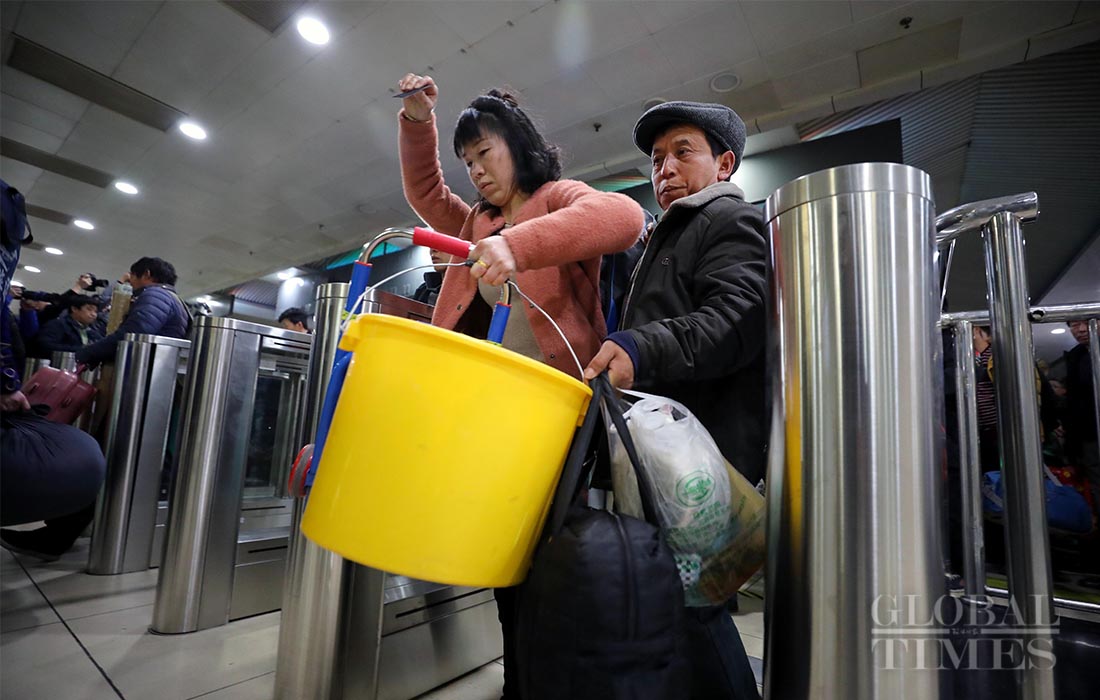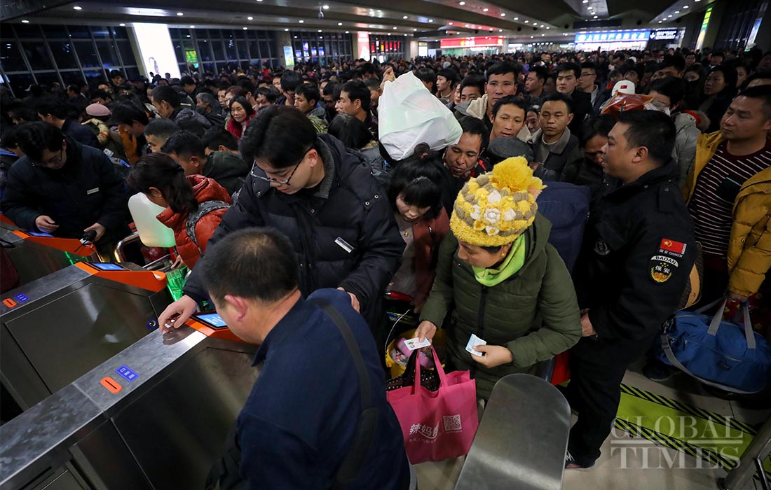 Passengers rush to get their tickets checked at the Shanghai Railway Station on January 17, 2019. Photo: Yang Hui/GT figcaption >