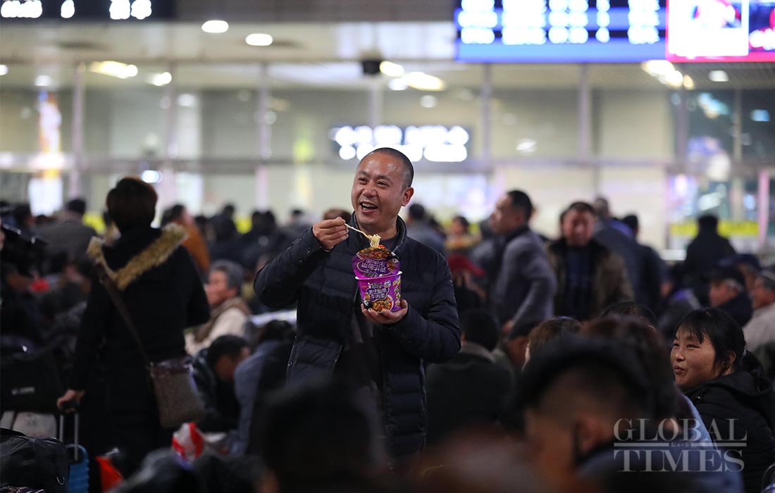 A passenger eats instant noodles as he waits for his train at Shanghai railway station Jan 17, 2019. Photo: Yang Hui/GT figcaption >