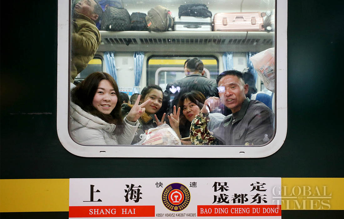 Passengers pose for the camera on a train on departure at Shanghai railway station Jan 17, 2018. Photo: Yang Hui/GT figcaption >