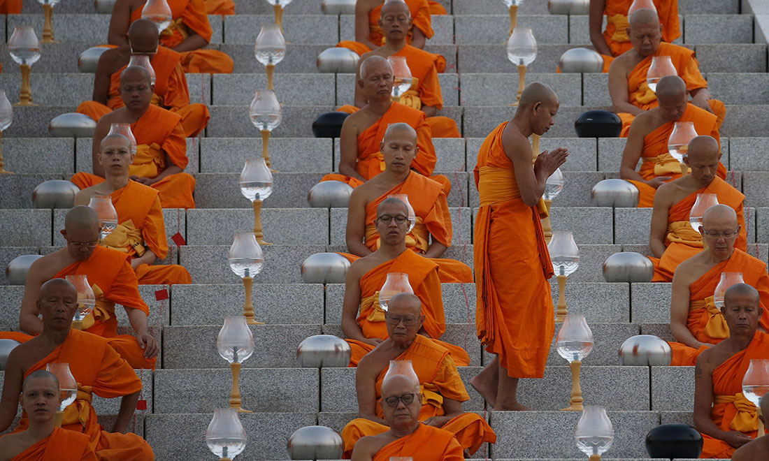 A monk walks among those seated in prayer during a ceremony on Makha Bucha in Pathum Thani province, north of Bangkok, on February 22, 2016. figcaption >