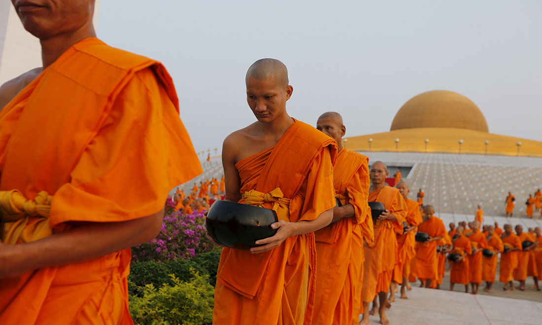Two monks walk in front of the Wat Phra Dhammakaya, which is considered one of the wealthiest temples in Thailand, before a ceremony marking Makha Bucha in Pathum Thani province, north of Bangkok, on February 22, 2016. figcaption >