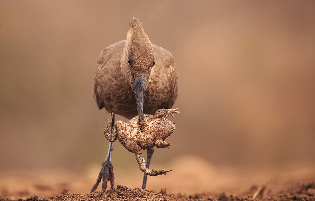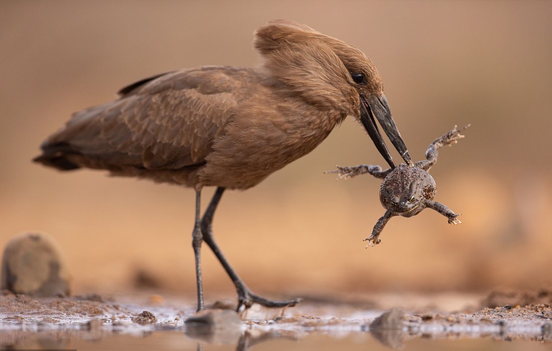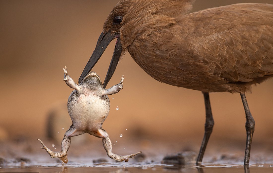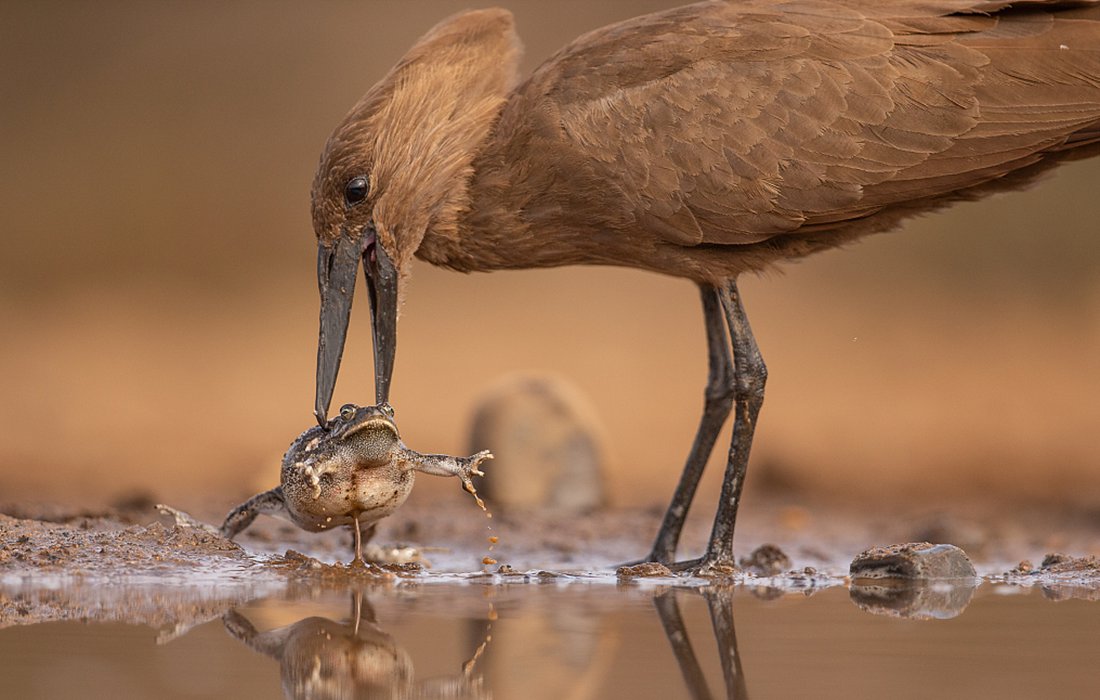 A toad quickly inhaled air and inflated to twice its size when it was grabbed by a wading bird. The hamerkop had to use its sharp beak to deflate the toad so as to sufficiently eat it. The primal struggle was captured by photographer Andreas Hembat at Zimanga Private Game Reserve in South Africa. (Photos: VCG)