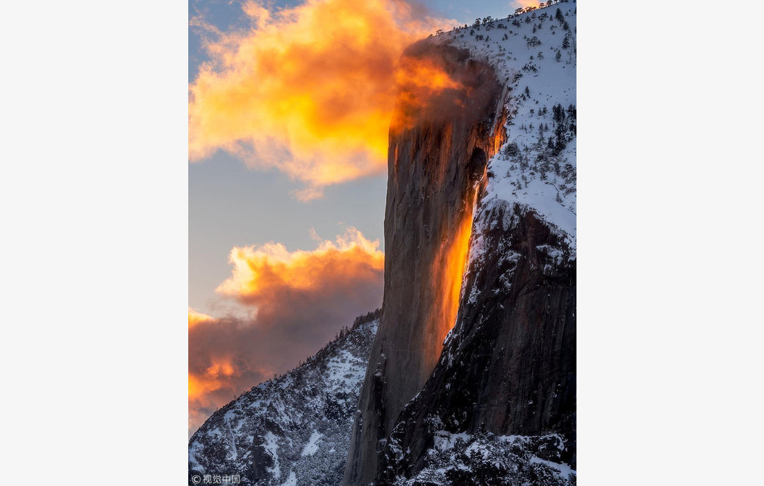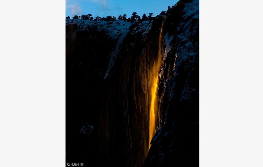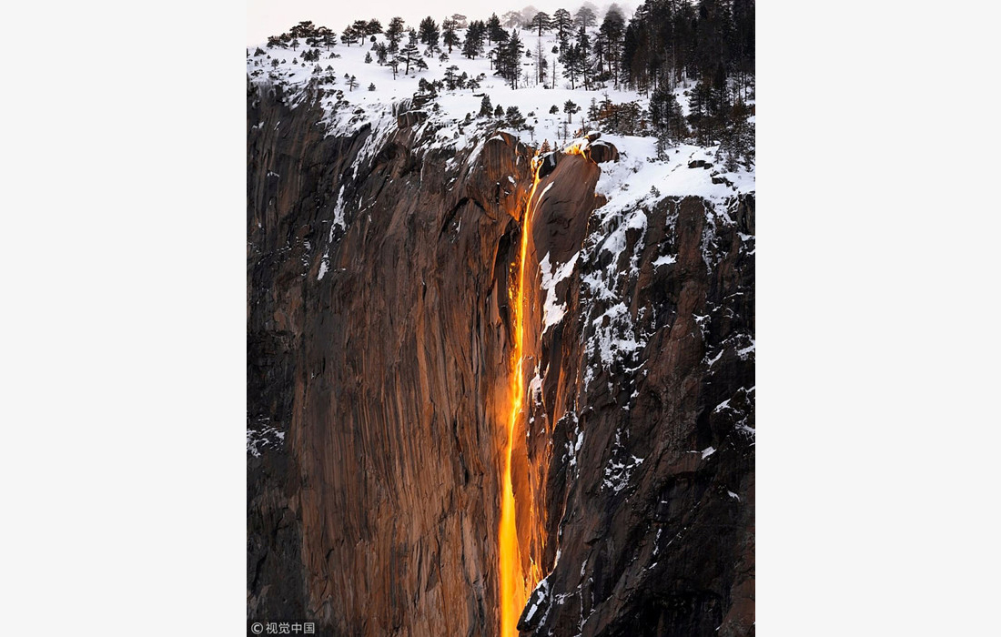 Sunlight turns Horsetail Fall into a “firefall” at Yosemite National Park in California, US. The setting sun illuminates the waterfall, making it glow orange and red. (Photos: VCG)