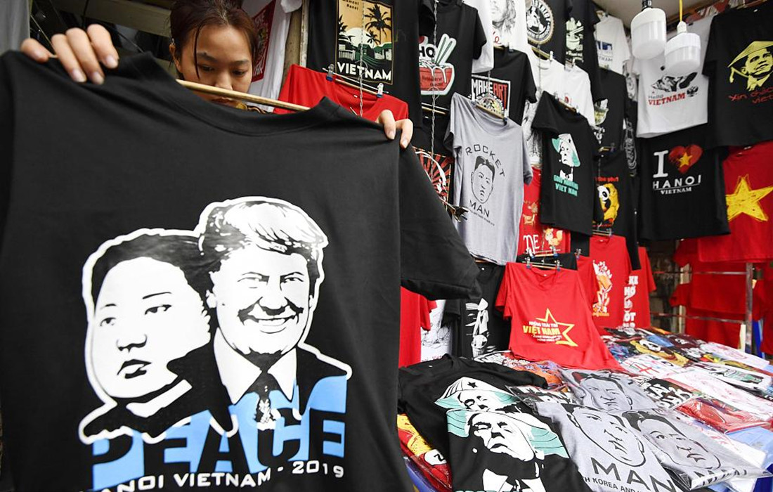 A woman checks out a T-shirts with images of Kim Jong-un and Donald Trump at a store in Hanoi, Vietnam, on February 25, 2019. Photo: VCG figcaption >