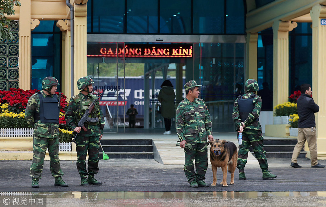 Vietnamese soldiers patrol at the Dong Dang Railway Station where North Korean leader Kim Jong-un is expected to arrive on February 25, 2019. Photo: VCG figcaption >