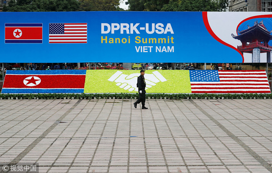 A security personnel passes by an ad for the high-level summit in Hanoi, Vietnam, on February 25, 2019. Photo: VCG figcaption >