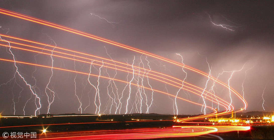 Mass lightning bolts light up the night skies by the Daggett Airport from monsoon storms passing over the high deserts, north of Barstow, California. Photo: VCG figcaption >