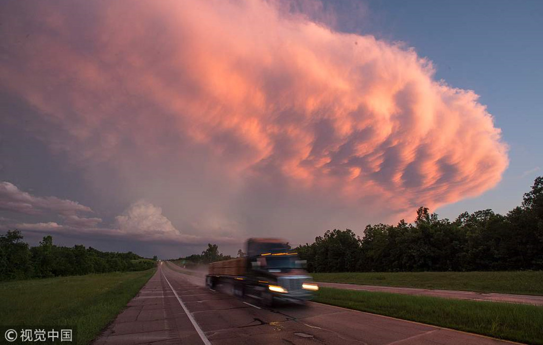 A truck drives as a super storm baring multiple tornado warnings expands across the sky near Hugo, Oklahoma. Photo: VCG