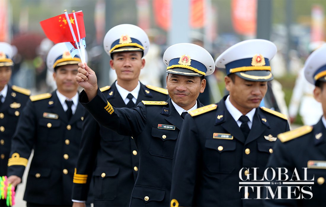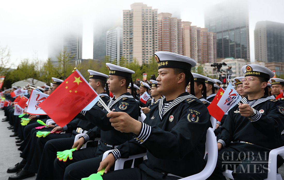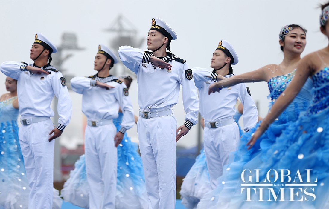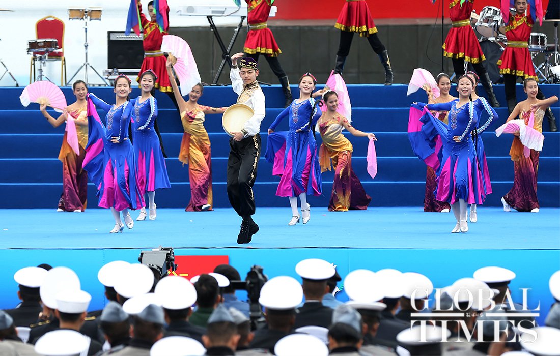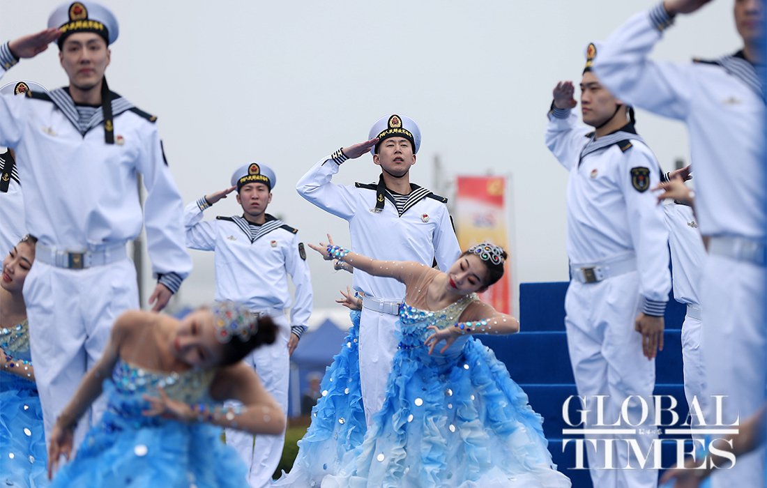 A Chinese navy choir sings at a joint concert in Qingdao Monday involving Chinese and foreign military bands. Ships from Chinese and foreign navies have gathered in the East China coastal city this week for events including a naval parade to mark the 70th anniversary of the founding of the People's Liberation Army Navy. Photos: Cui Meng/GT figcaption >