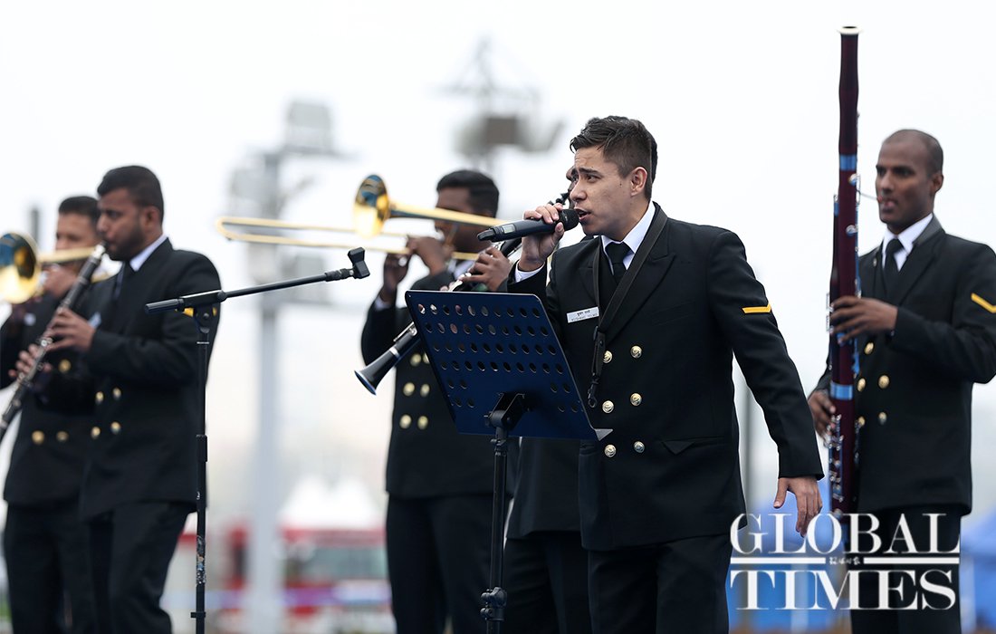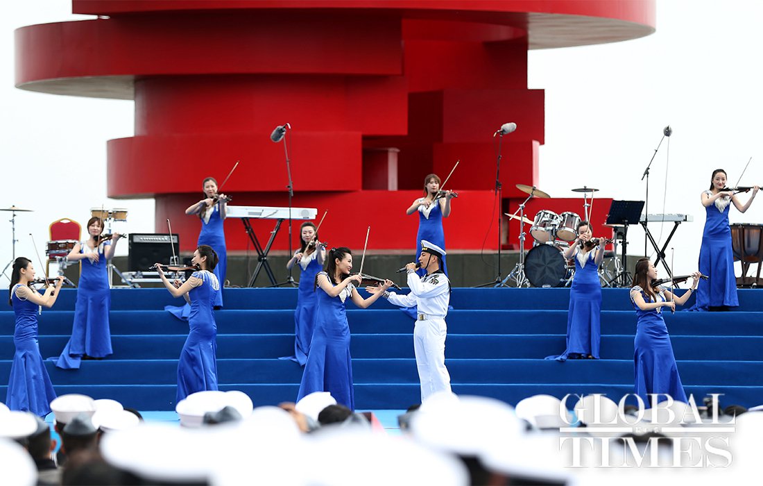 A Chinese navy choir sings at a joint concert in Qingdao Monday involving Chinese and foreign military bands. Ships from Chinese and foreign navies have gathered in the East China coastal city this week for events including a naval parade to mark the 70th anniversary of the founding of the People's Liberation Army Navy. Photos: Cui Meng/GT