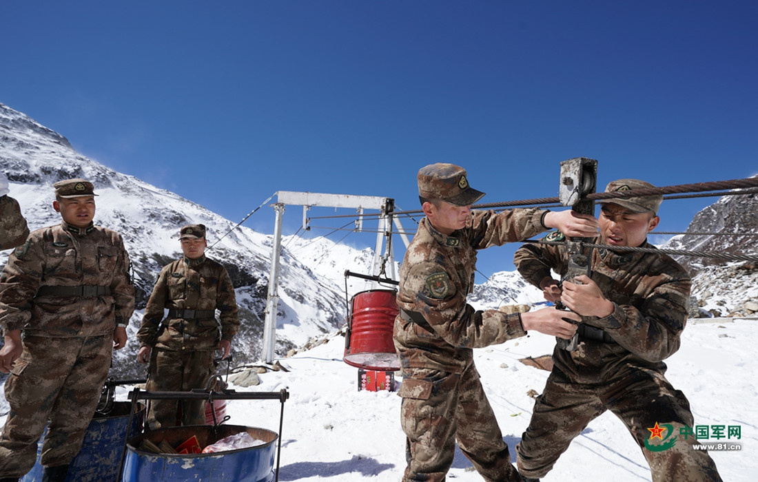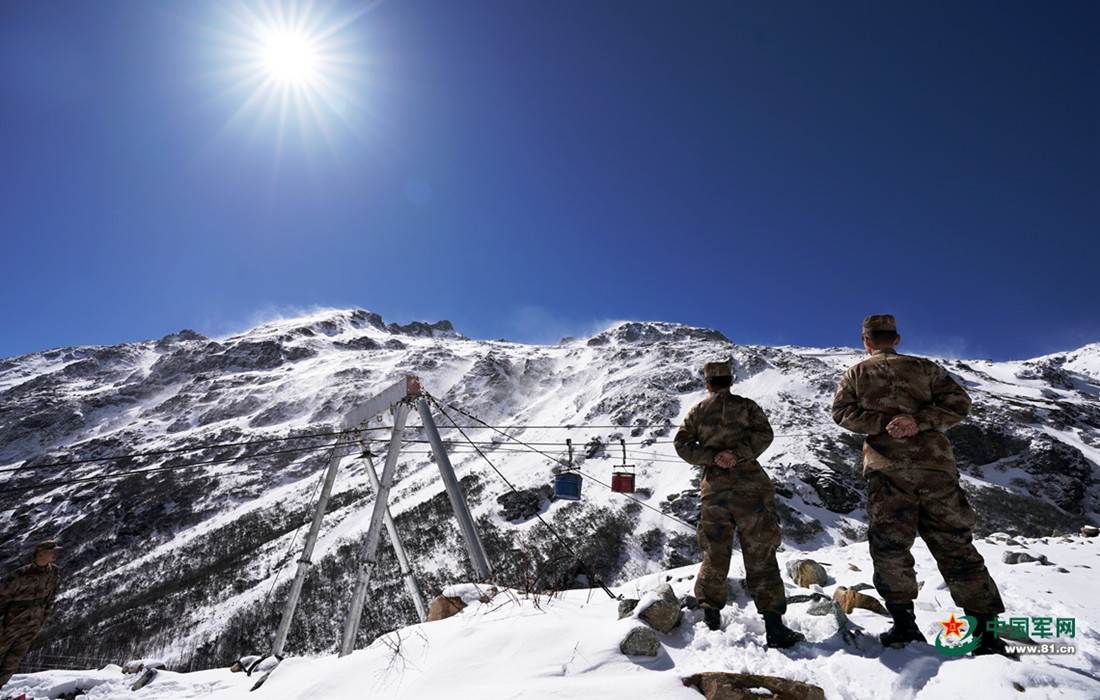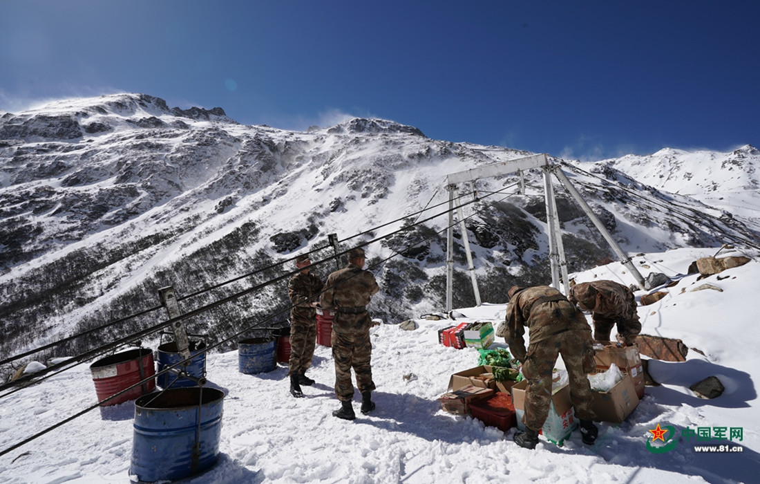 Soldiers are seen transporting goods through ropeways at a sentry post in the mountainous area of China’s Tibet Autonomous Region. Heavy snow seals the area for almost seven months a year. Built in 2018, the 2.8 km ropeways are only used to transport goods. (Photos: 81.cn)
