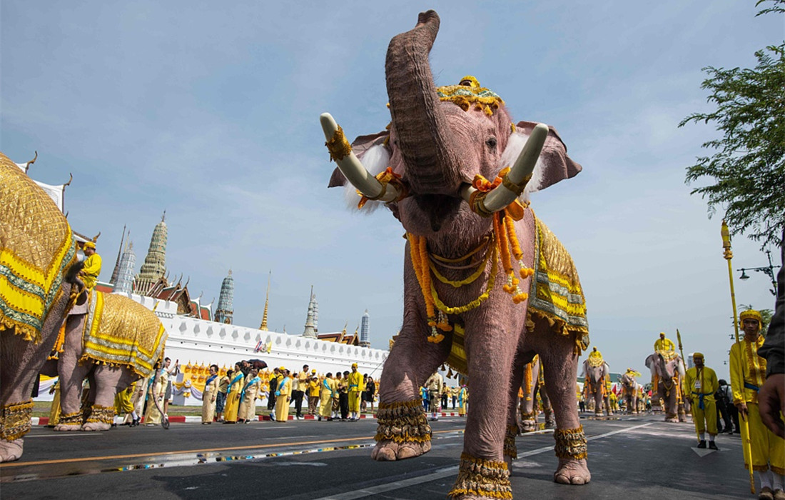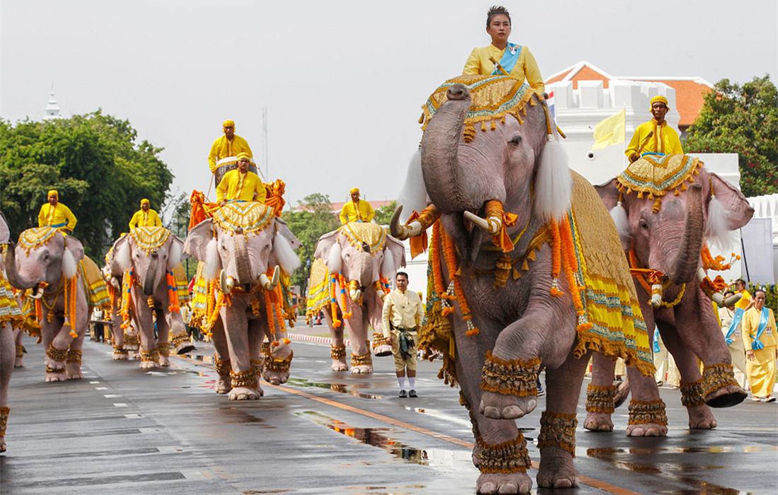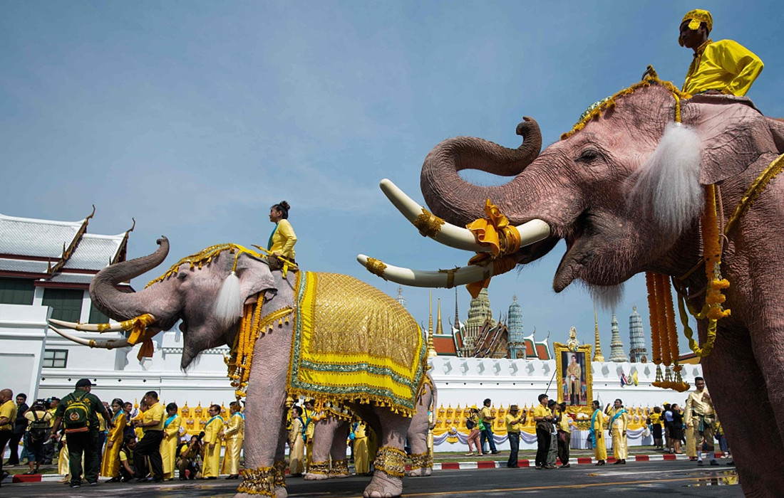 Together with other well-wishers, mahouts rode elephants to salute King of Thailand Maha Vajiralongkorn near the Grand Palace in Bangkok on May 7, 2019. (Photos: VCG)