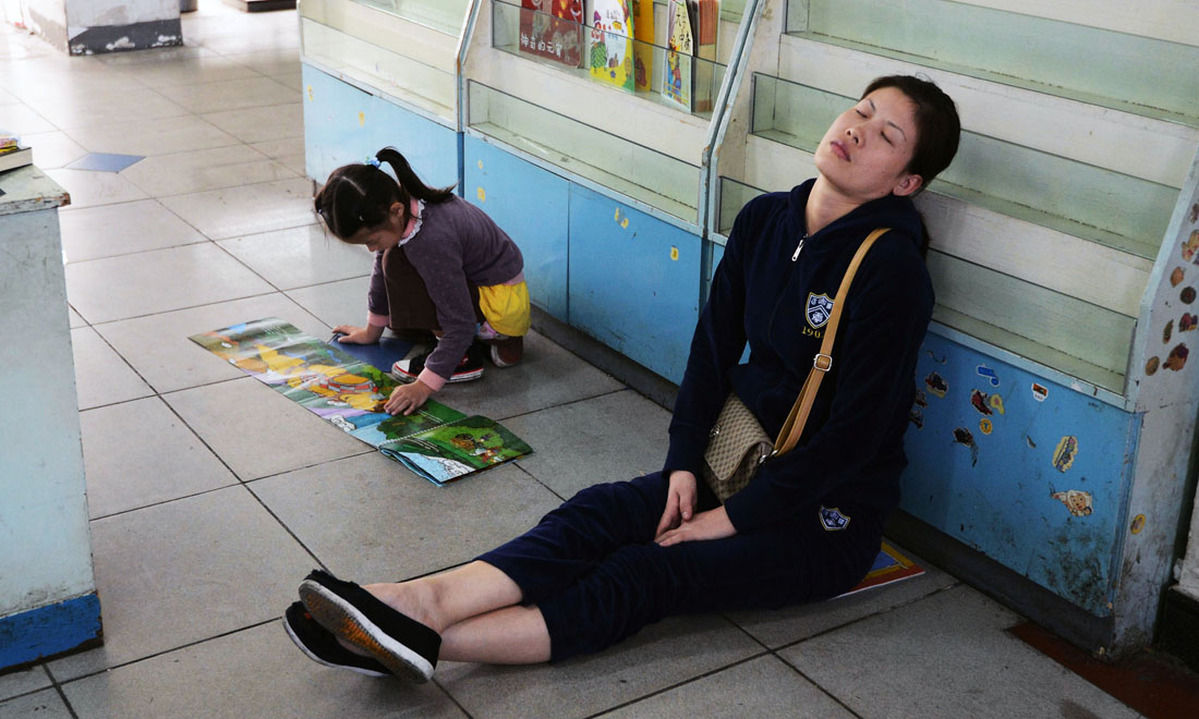 A mother falls asleep on the floor as her daughter reads at the Xinhua Bookstore on October 7, 2012. figcaption >