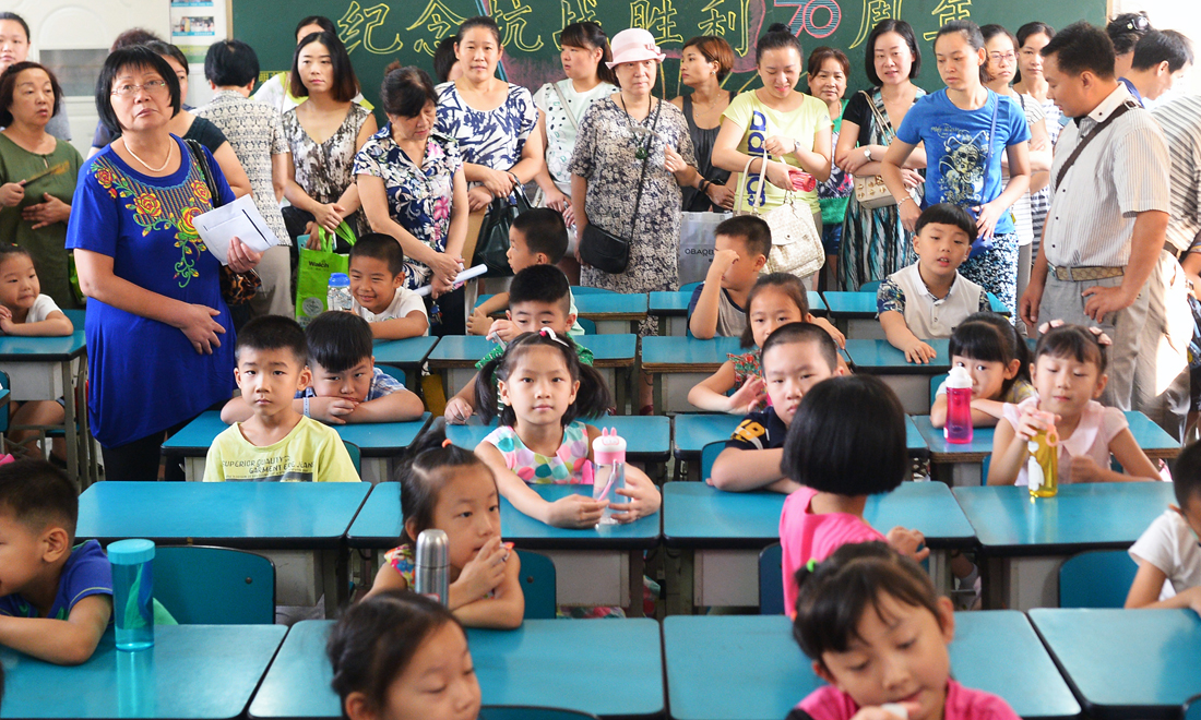 Parents of grade one students crowd the back of a classroom at Yucai No.2 Primary School, watching how their kids perform as new students, on August 31, 2015. figcaption >