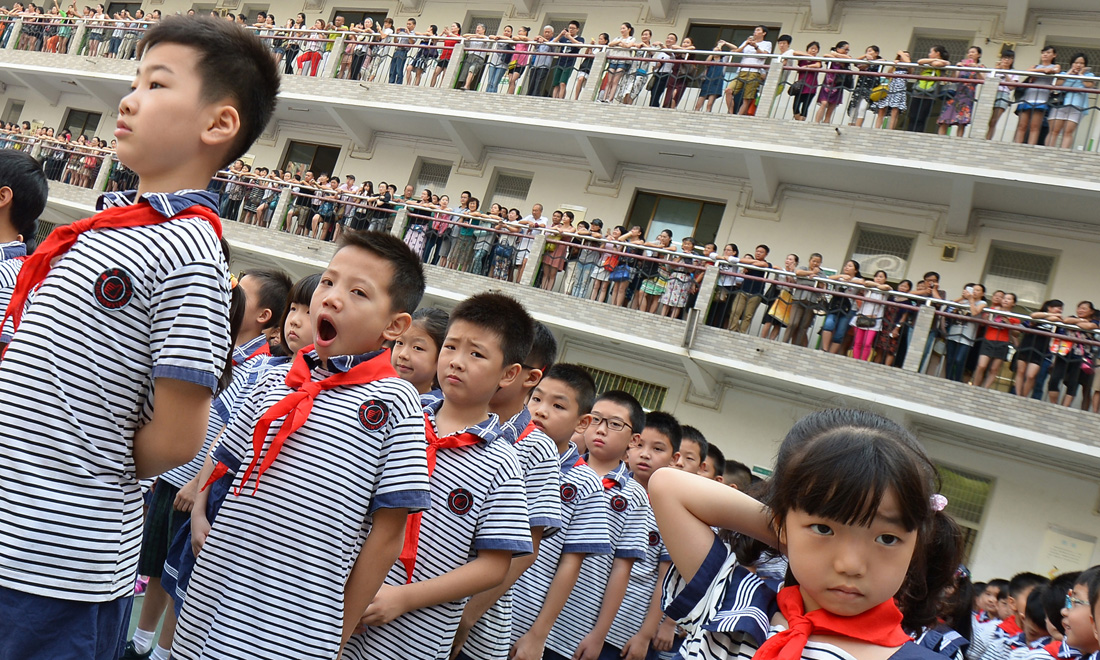 Hundreds of parents watch the opening ceremony of a new semester at the Yucai No.2 Primary School on September 1, 2015. figcaption >