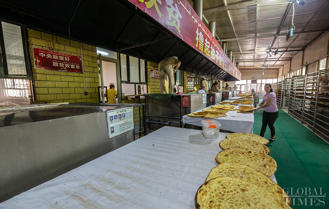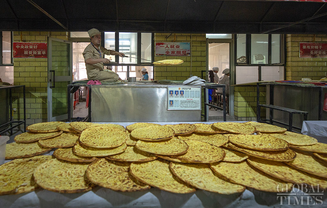 Photos taken show local workers making nan bread in a factory in Kuche county, Northwest China's Xinjiang Uyghur Autonomous Region. The factory teaches local residents how to make nan and then hires them for an average monthly salary of 5,000 yuan ($724.7). A total of 8,000 to 10,000 nan breads are made each day in the factory and its two branches, some are sold across China through e-commerce platforms. The factory is also a folk attraction for tourists to know about nan, the most popular staple food in Xinjiang. (Photos: Yang Ruoyu/GT)