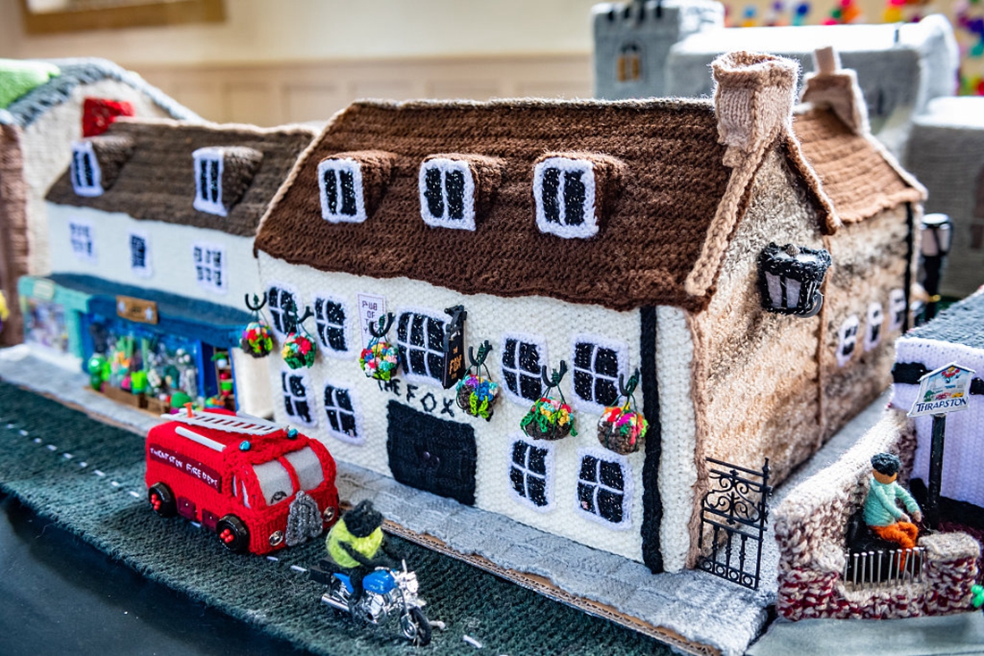 A knitted version of The Fox pub in the village of Thrapston, Northamptonshire recreated by the 'Yarn Bombers'. Photo: VCG figcaption >