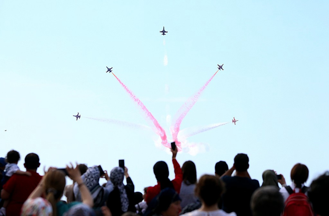 An enthusiastic crowd cheering up as the aerobatic demonstration team of the Turkish Air Force "Turkish Stars" exhibit a stellar performance in the sky of Trabzon, Turkey on July 7, 2019. Photo: Hakan Burak Altunoz/Anadolu Agency/Getty Images/VCG figcaption >