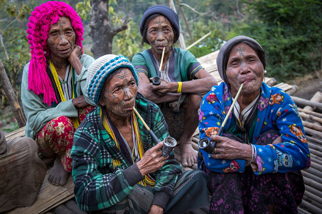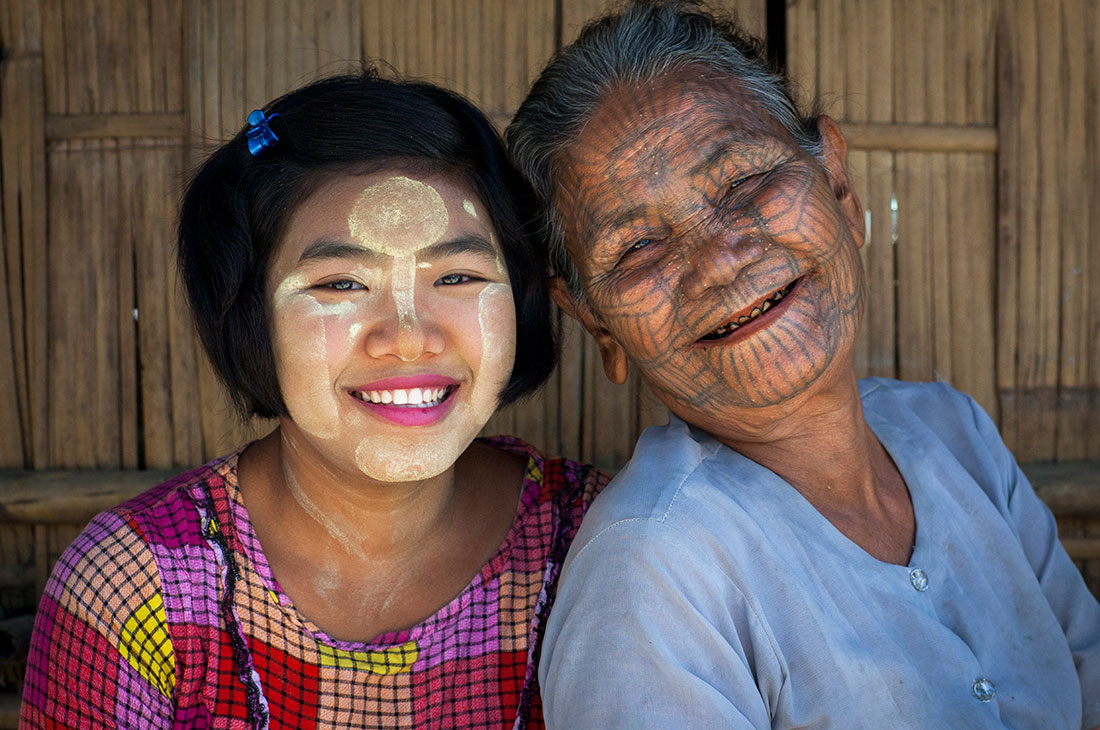 A woman (right) with a spiderweb-like facial design from Myanmar’s Chinn tribe, February 2015.