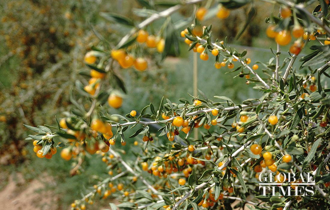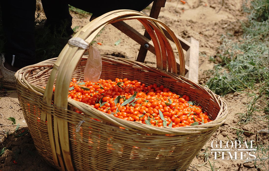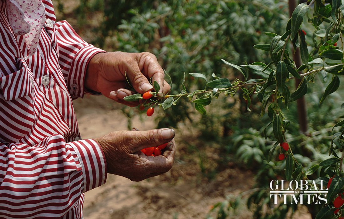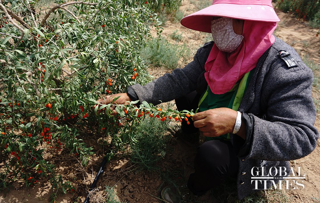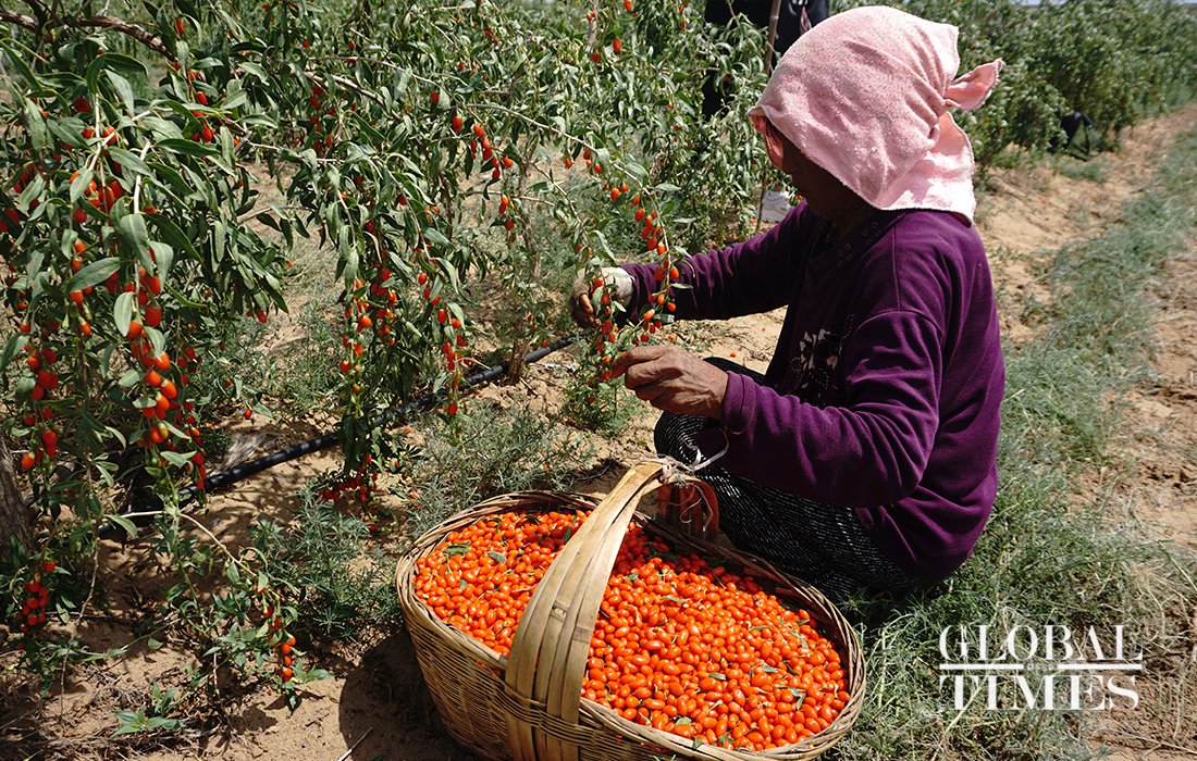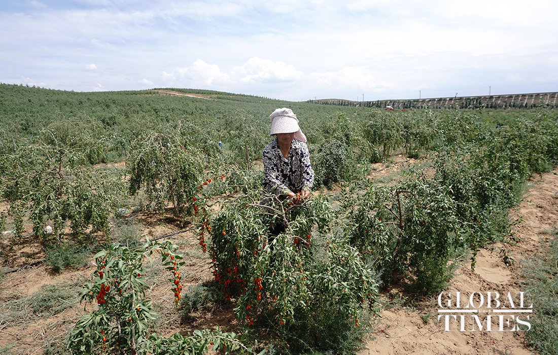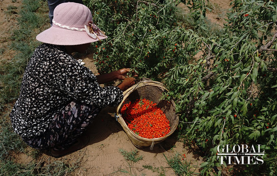 Farmers harvest goji berries in Zhongning county, Northwest China's Ningxia Hui Autonomous Region, on July 11. As the "hometown of goji," Zhongning county has a history of cultivating goji for over 600 years. As a pillar industry for poverty alleviation in Zhongning, now there are 200,000 mu (13,333 hectare) of goji cultivated in the country. In 2018, the production of goji in Zhongning topped 42,000 tons, with a value of 7.37 billion yuan ($1.07 billion). (Photos: Liu Xiaojing/GT)
