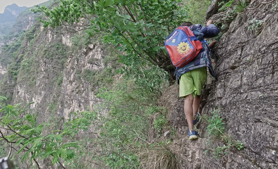 The hard way to school: Children climb 800 meter cliff by vines ladders in Southwest China
