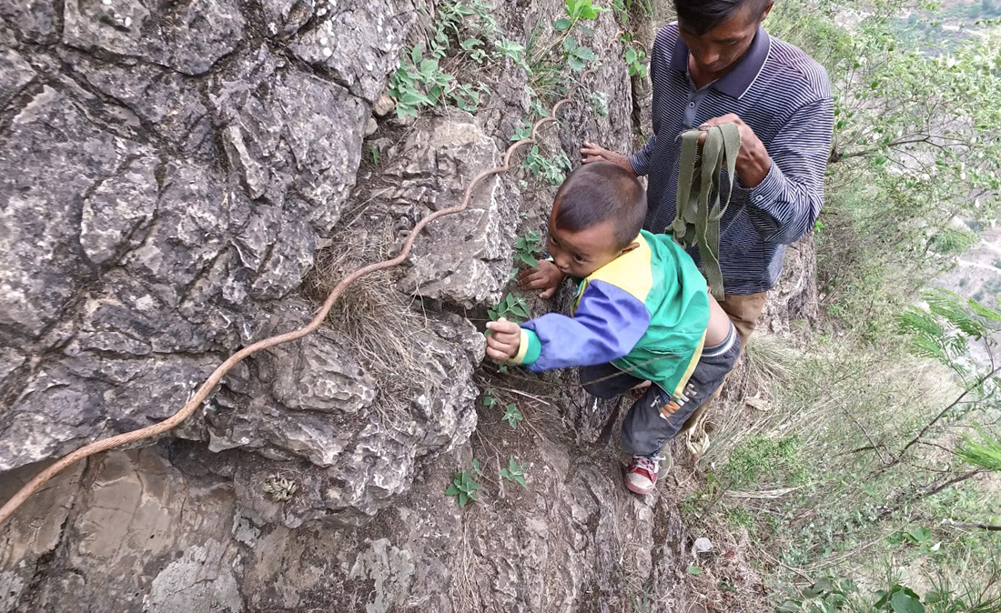 Villager Chen Guji helps his son to climb the cliff with a simple safety harness. Photo: CFP figcaption >