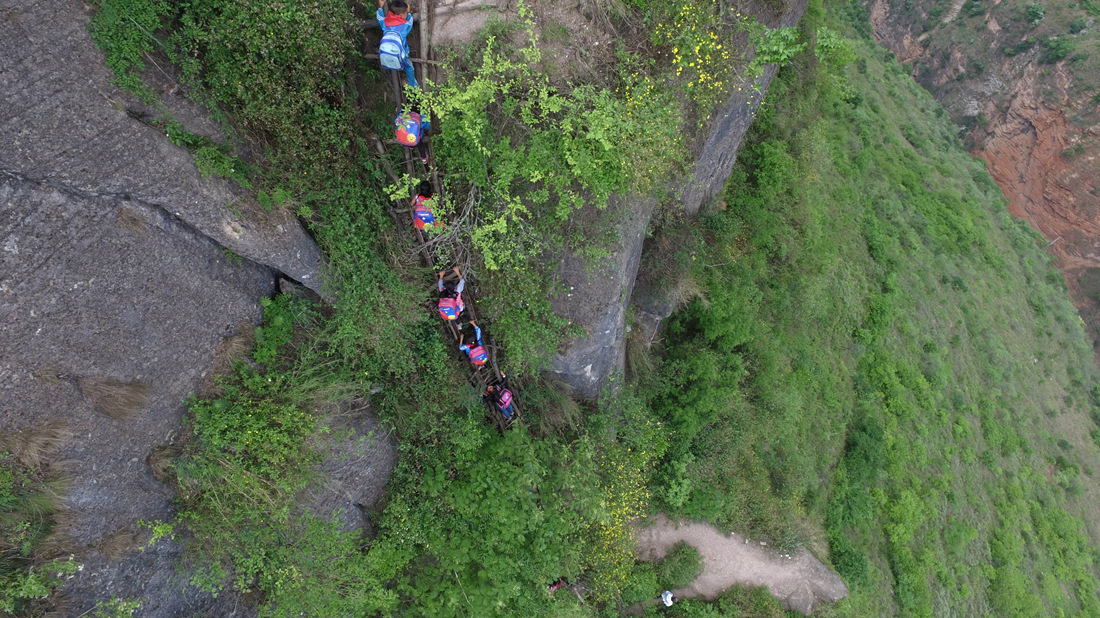 A line of children climb the ladder on the way back home in Liangshan, Southwest China's Sichuan Province on May 14. Photo: CFP