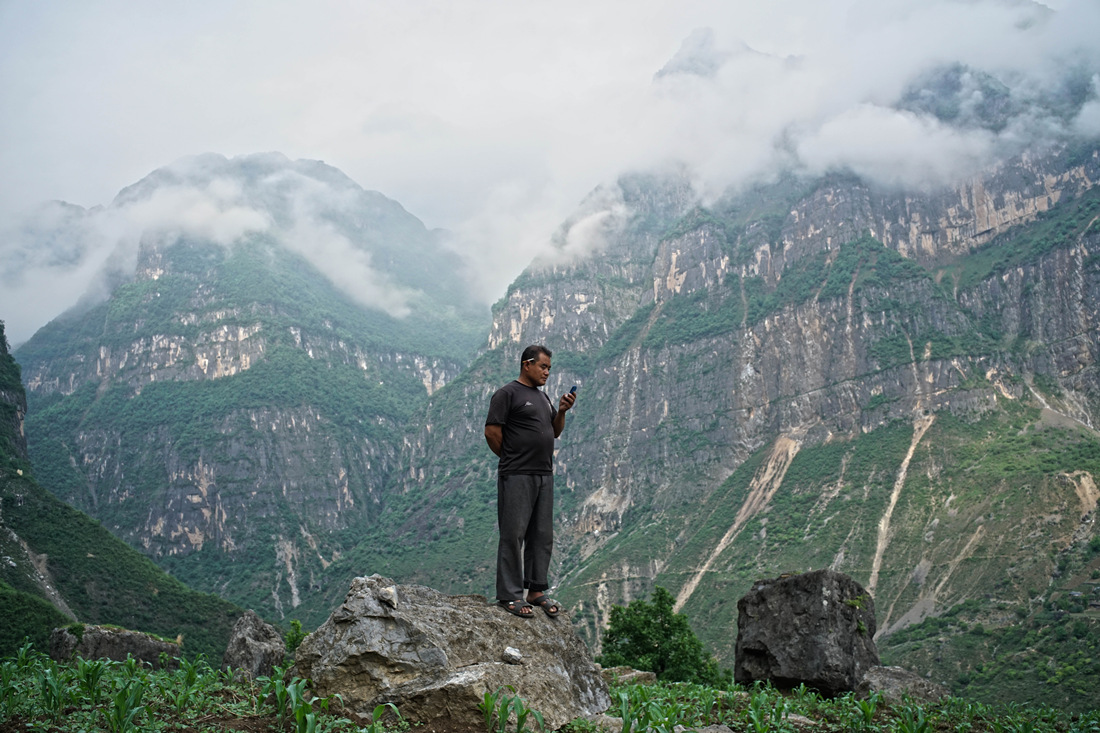 A villager ventures to the edge of the cliff in search of a signal for his mobile phone. Photo: CFP figcaption >
