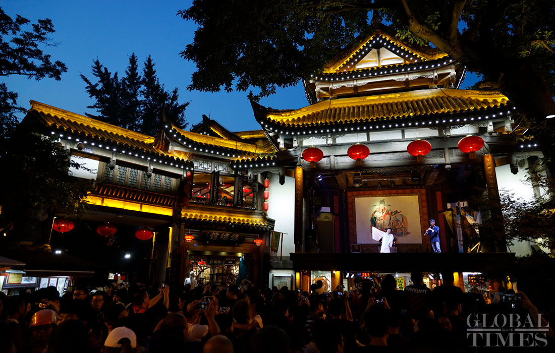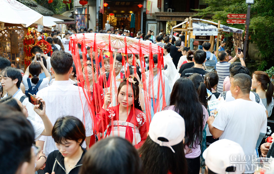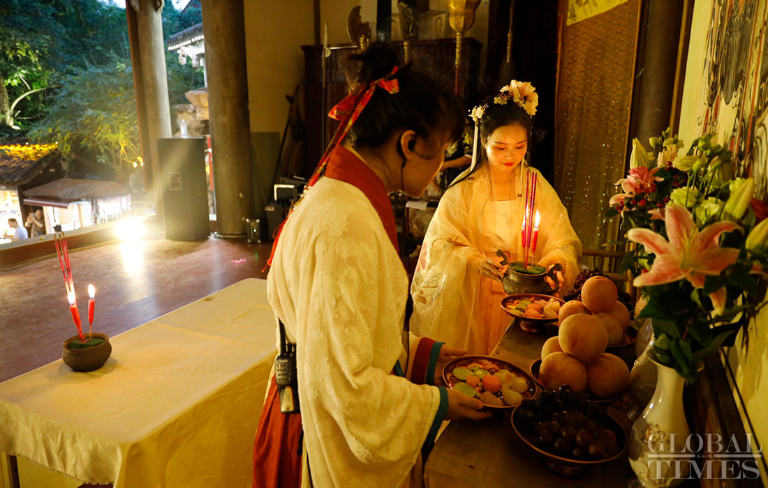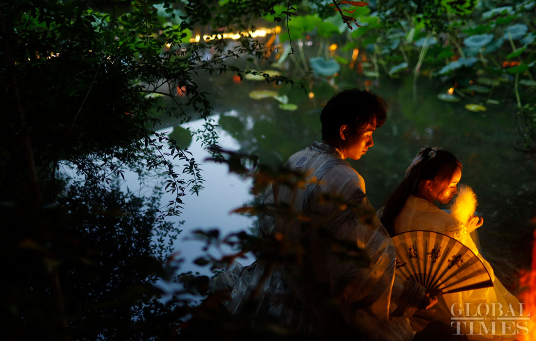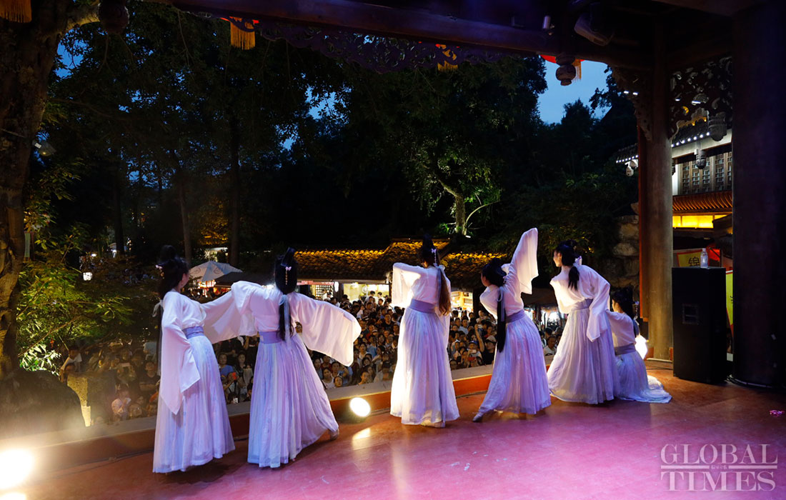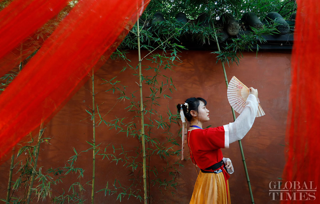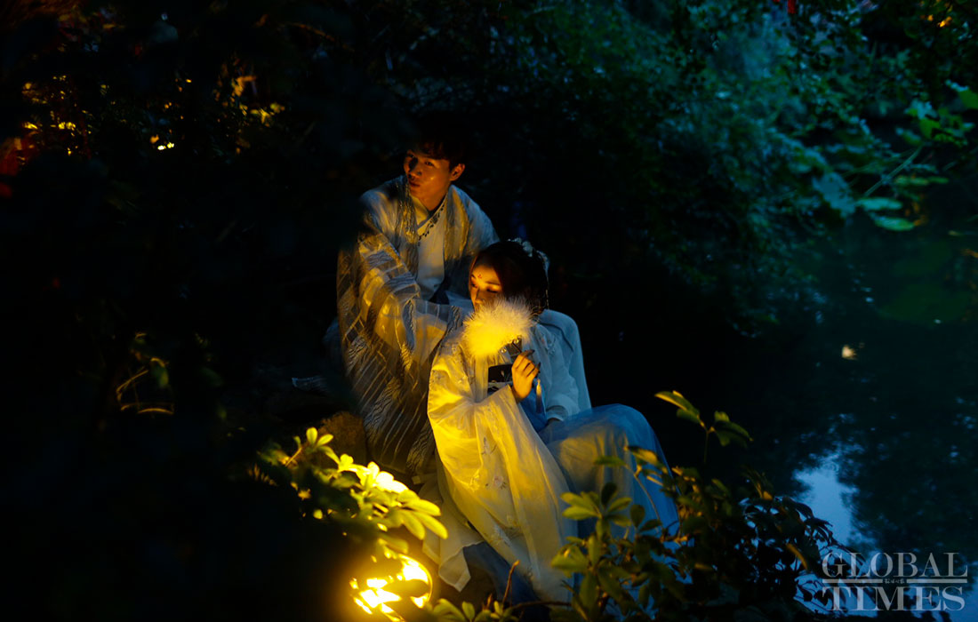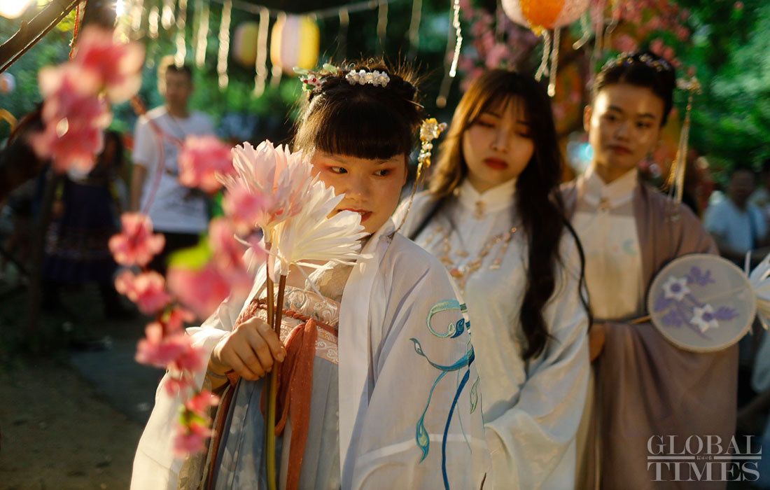 A group of people wearing hanfu, traditional clothing for the han ethnic group, perform a variety of cultural activities including touring the garden, worshiping the moon and dancing on August 7, 2019, which is Qixi festival, or Chinese Valentine’s Day, in Jinli, Chengdu, capital of Southwest China’s Sichuan Province. (Photos: Li Hao/GT)