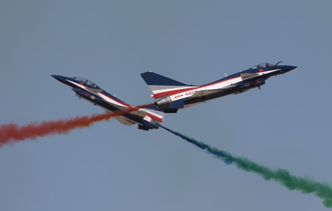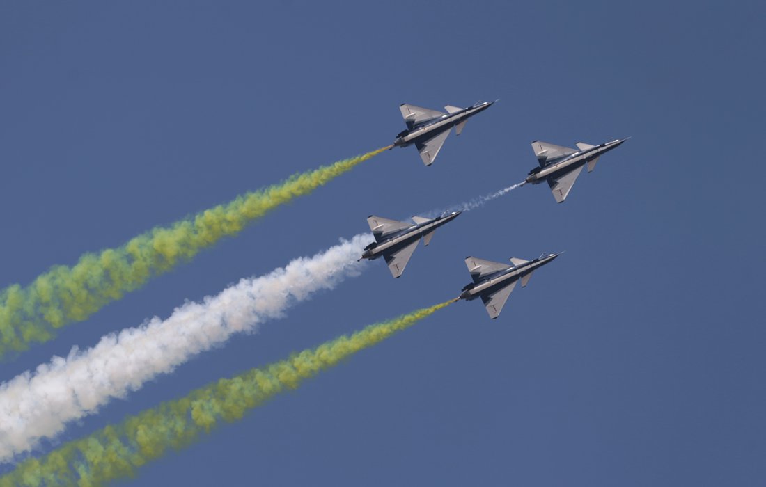August 1st Aerobatic Team enthralls the visitors with a colorful performance during the Chinese Air Force's open day event in Changchun, NE China’s Jilin on Oct 17, 2019. Photo: VCG figcaption >