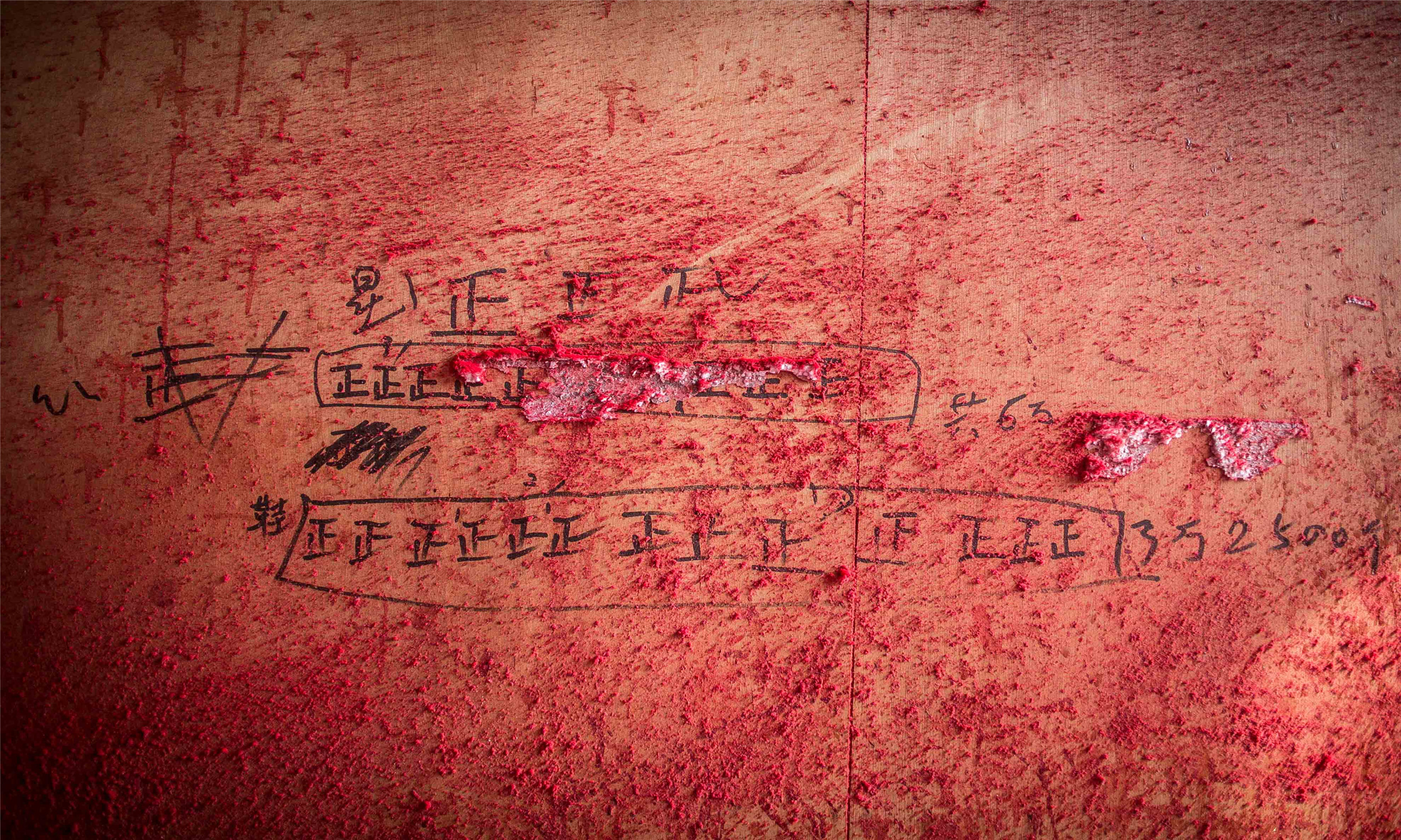 Wei records the number of items he process on a wall. Wei works more than 10 hours a day, starting from 7:00 am. He earns around 3,000 yuan ($485) a month. Photo: Chen Ronghui