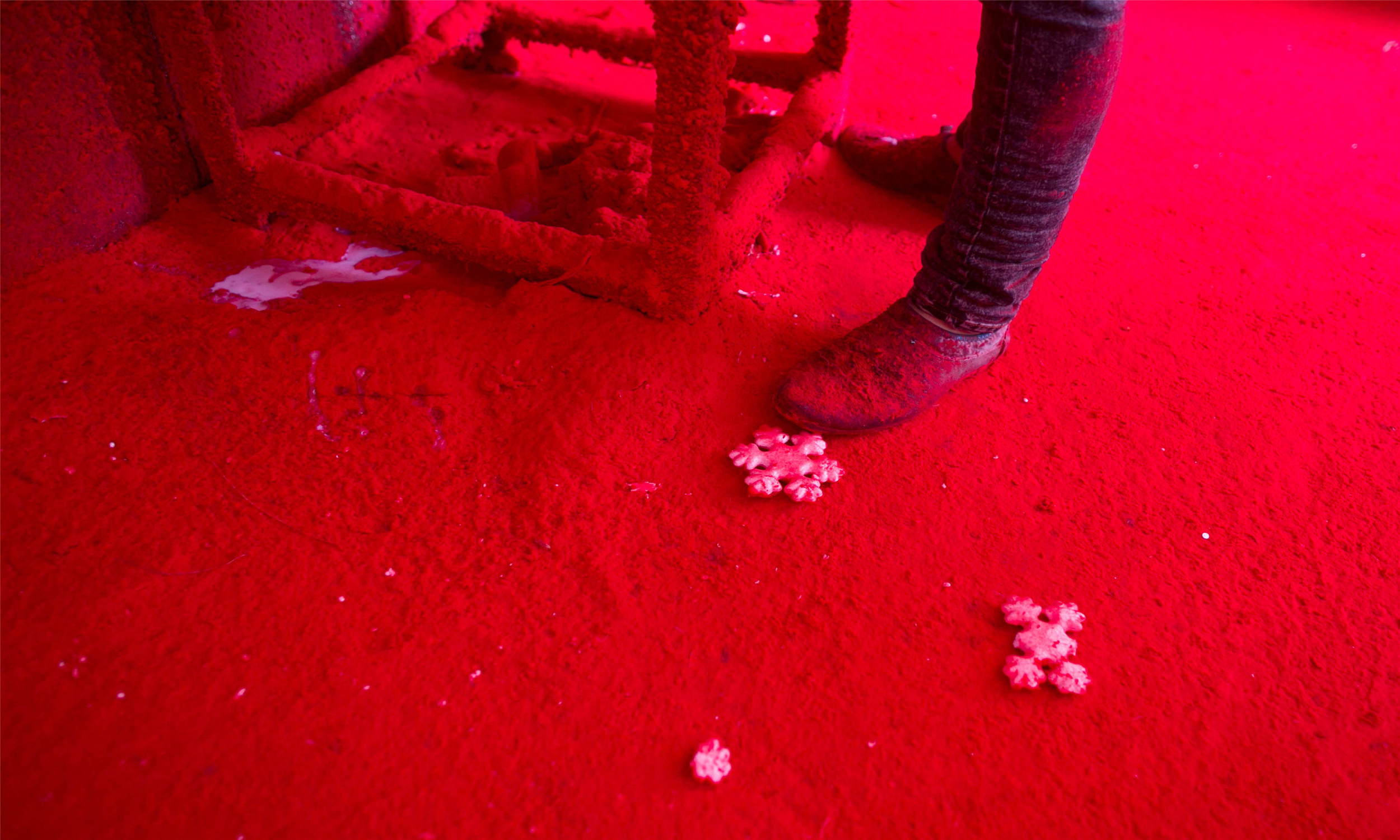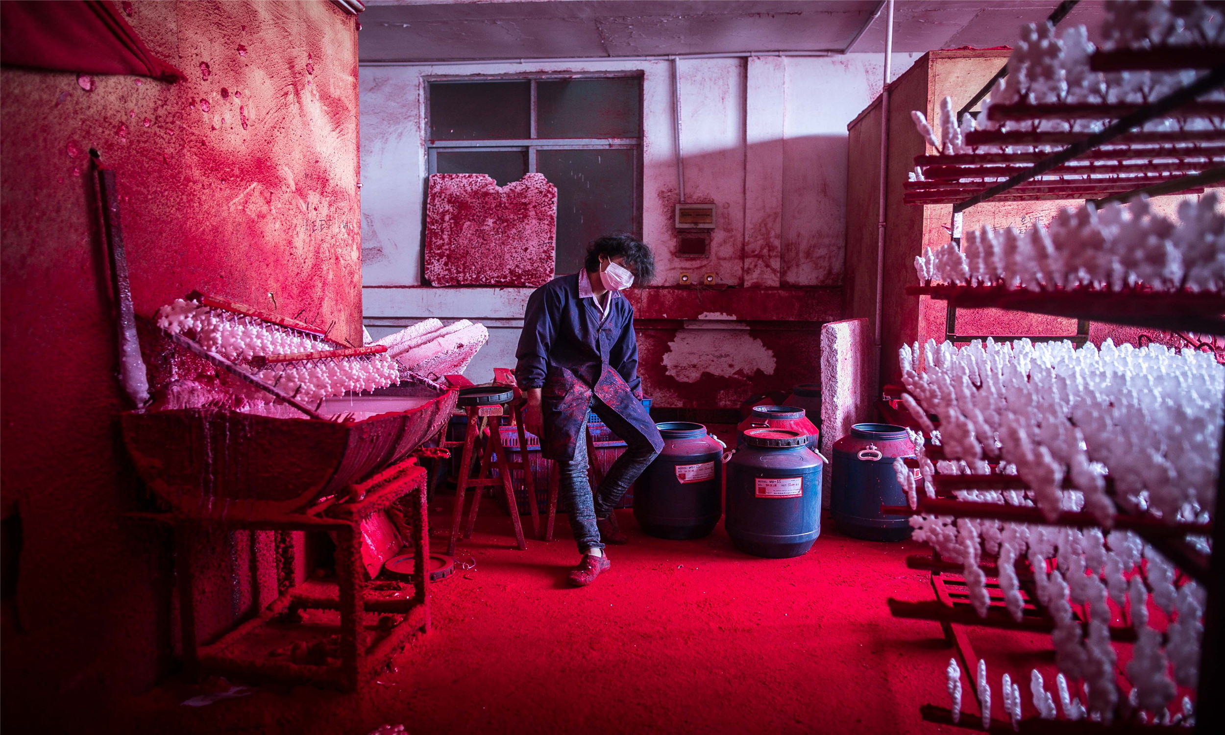 A worker sprays a powdery red coating on snowflake ornaments at a Christmas products factory in Fotang town, Yiwu, Zhejiang Province, on December 4, 2014. The ground is covered with a layer of the adhesive coating. Photo: Chen Ronghui
