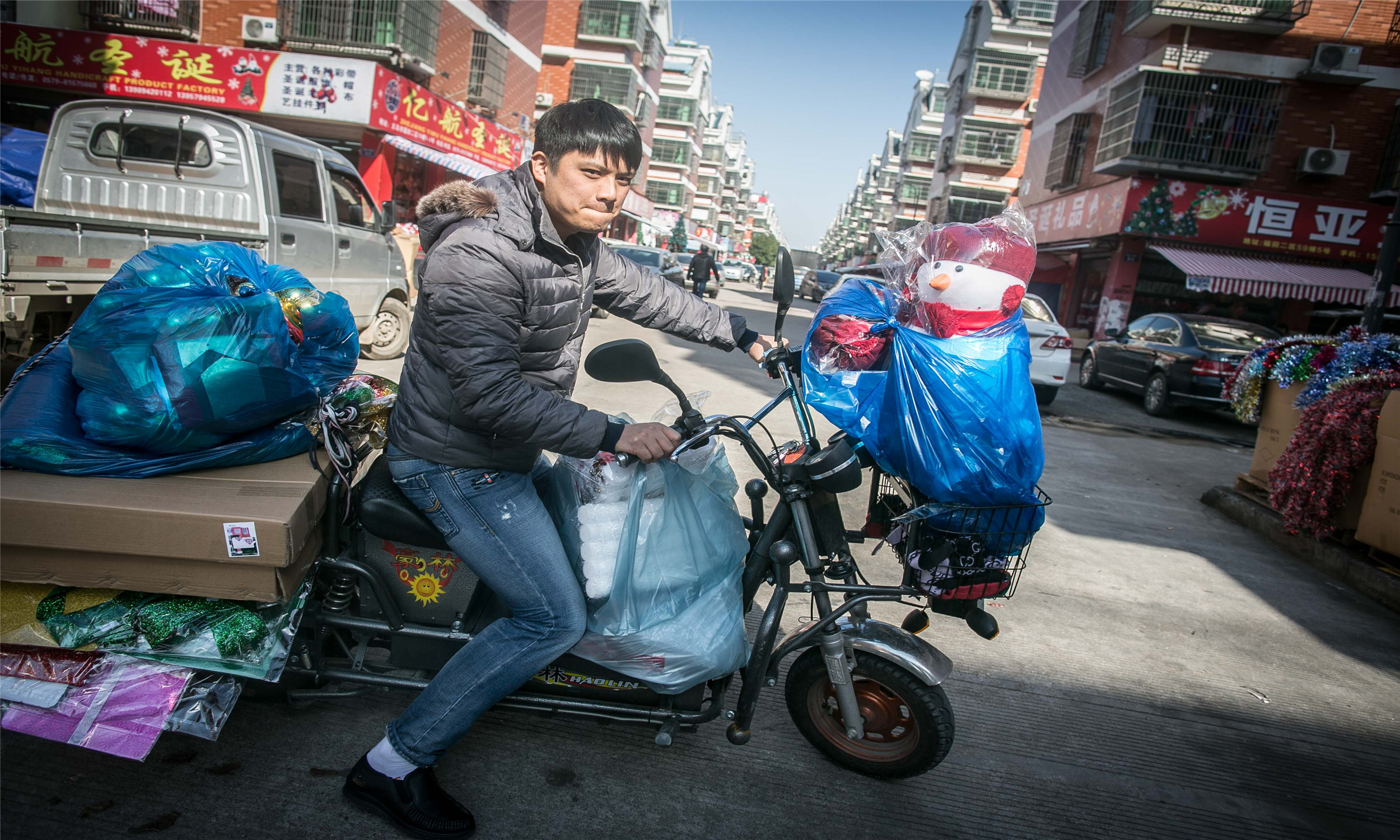 A vendor rides his motorcycle loaded with Christmas decorations in Zone No. 2 of the Futian Market, also known as the "Christmas Village of China." Photo: Chen Ronghui
