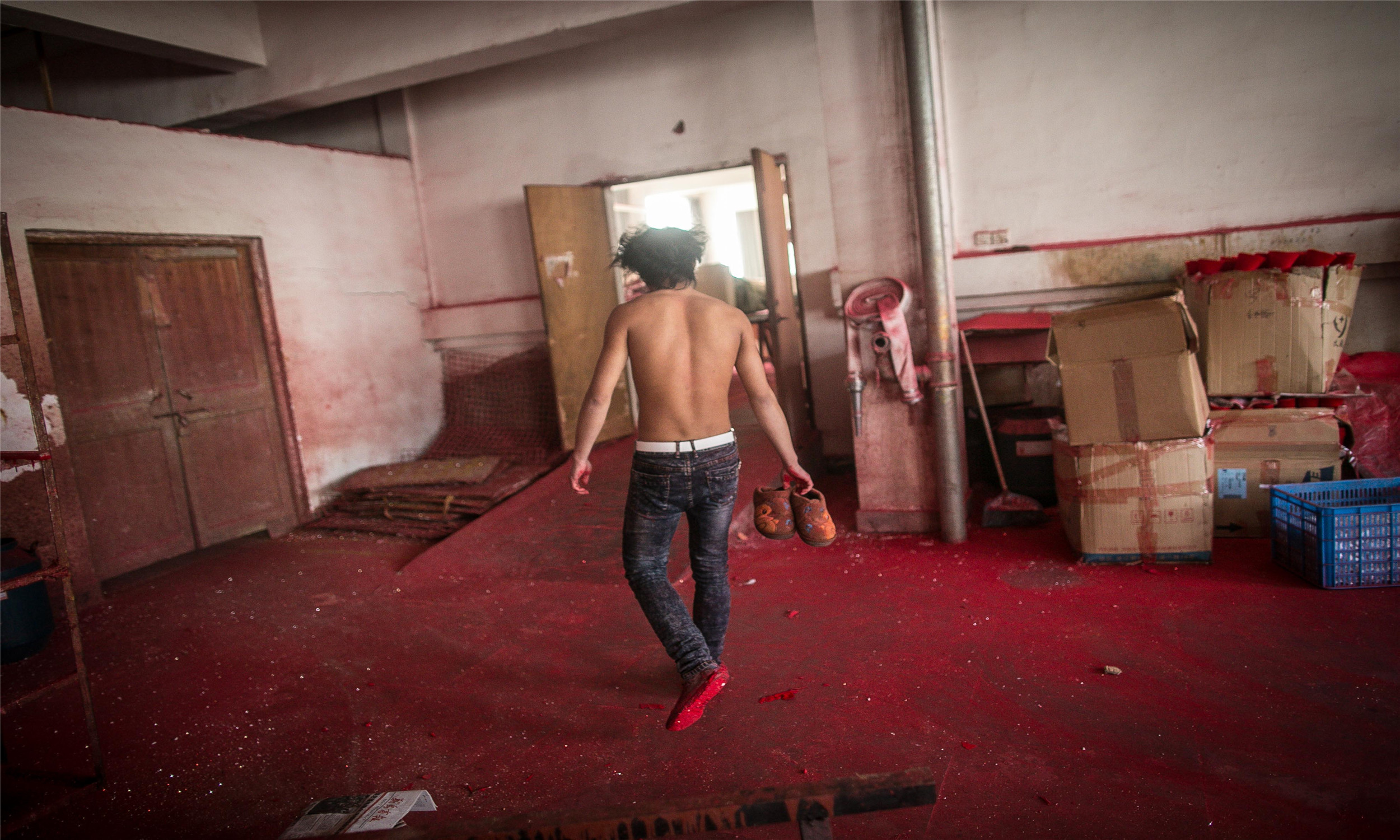 Junior Wei leaves the workshop after finishing his morning work. He said he makes sure to be clean before leaving the workshop. But since he doesn't have time to get a haircut, his hair always has traces of red powder. "Well, I just see it as hair dye," he said.